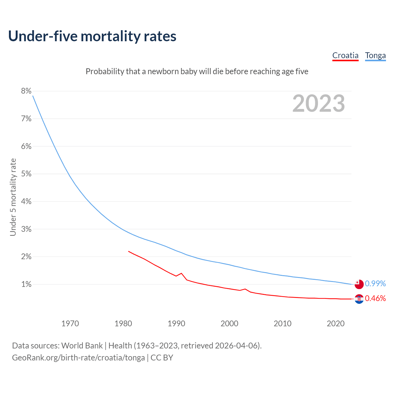 The chance that a newborn baby will die before reaching age five is 0.46% in Croatia and 0.99% in Tonga. Above is a chart with historical data on under-five mortality rates.