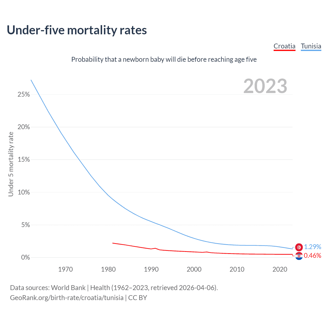 The chance that a newborn baby will die before reaching age five is 0.46% in Croatia and 1.29% in Tunisia. Above is a chart with historical data on under-five mortality rates.