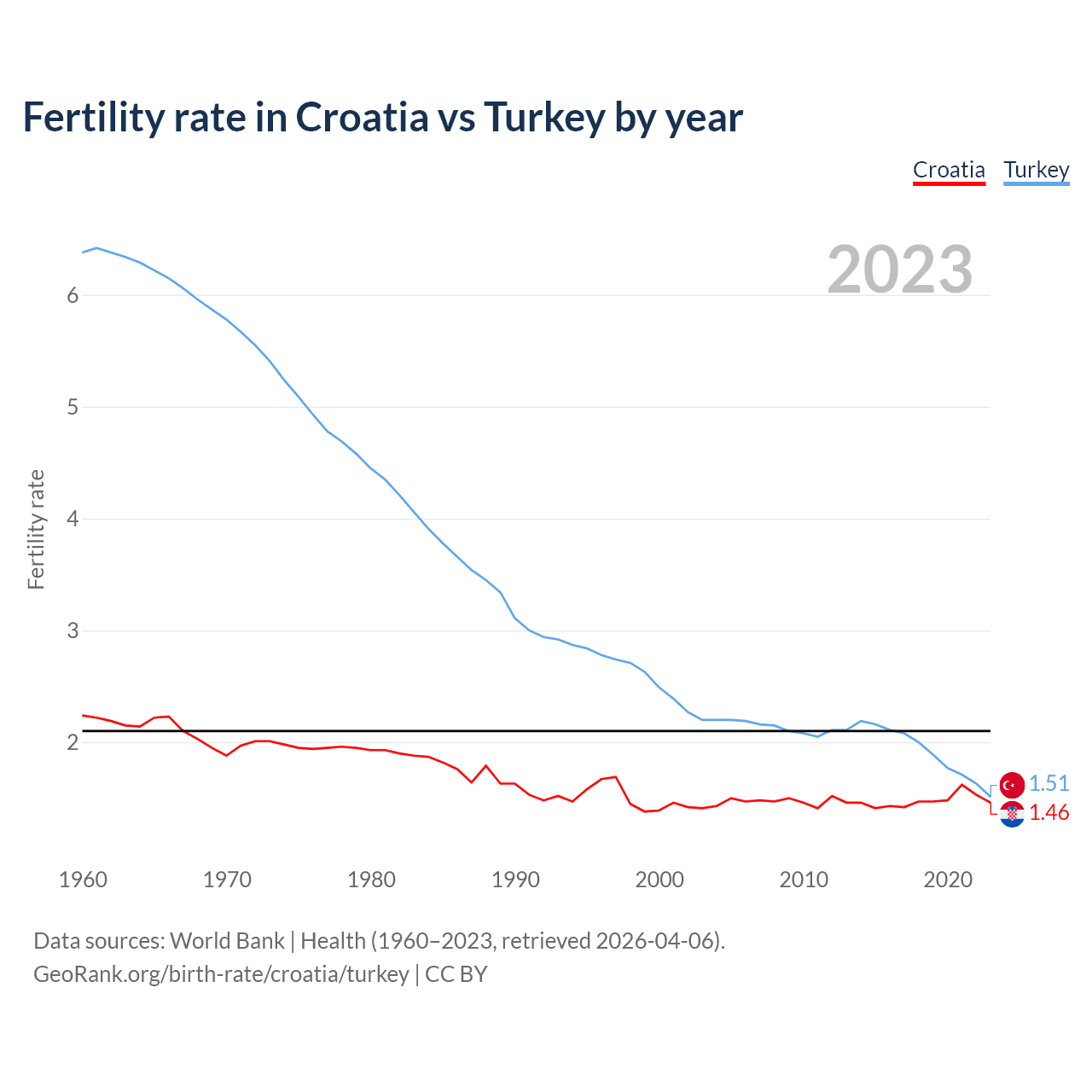 1960 vs 2023, the fertility rate has decreased by 34.8% in Croatia and by 76.3% in Turkey — in 1960, it was 2.24 and 6.38, respectively.