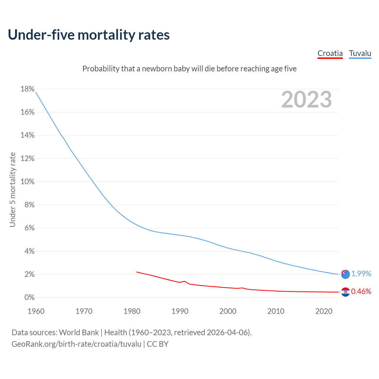 The chance that a newborn baby will die before reaching age five is 0.46% in Croatia and 1.99% in Tuvalu. Above is a chart with historical data on under-five mortality rates.