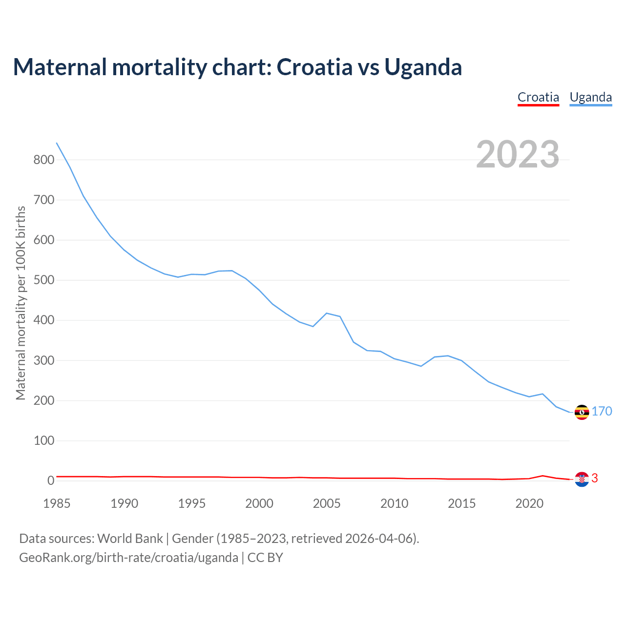 The maternal mortality rate, which is the probability of dying during childbirth or within 42 days of pregnancy termination, is 3 deaths per 100,000 live births in Croatia, compared to 170 deaths in Uganda.