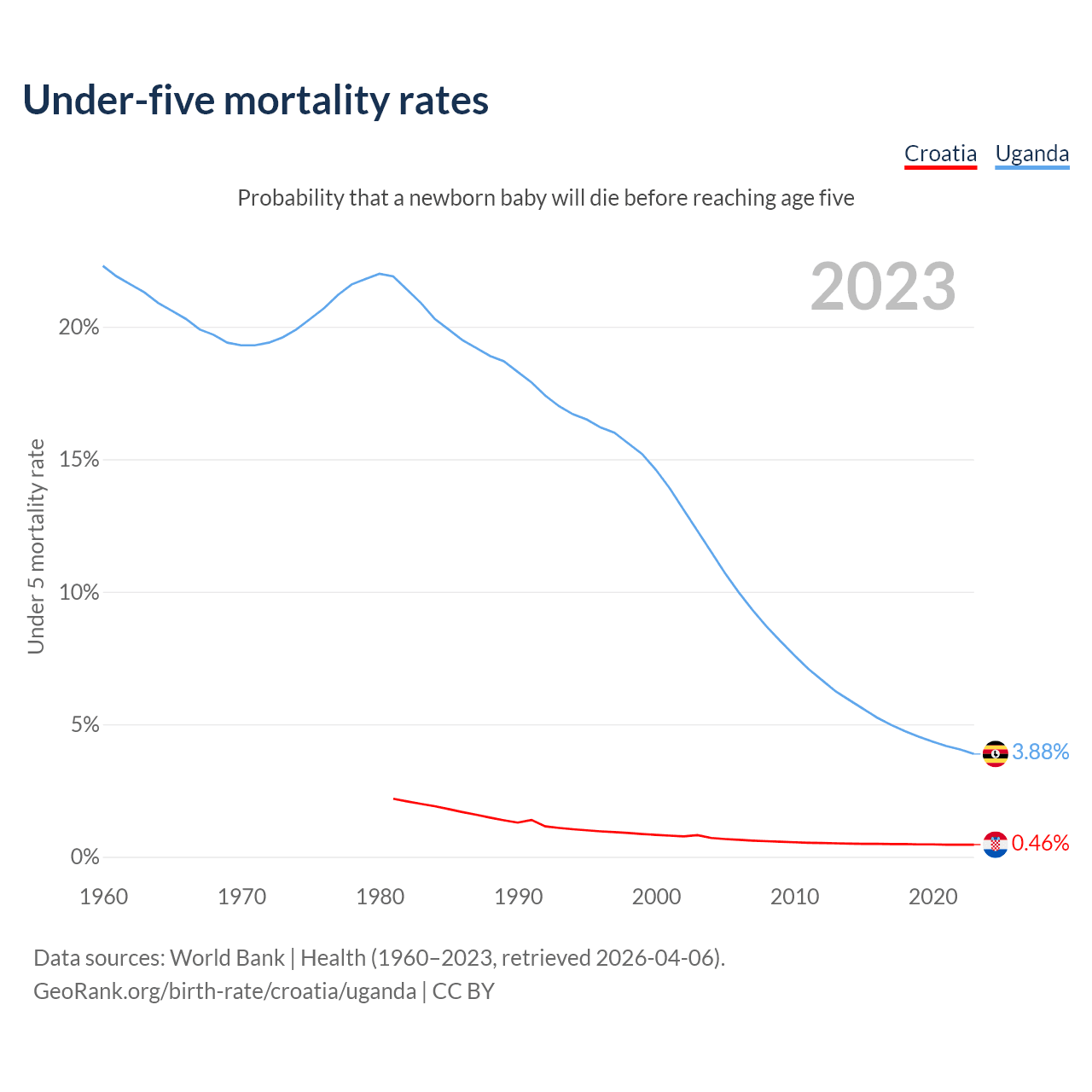 The chance that a newborn baby will die before reaching age five is 0.46% in Croatia and 3.88% in Uganda. Above is a chart with historical data on under-five mortality rates.