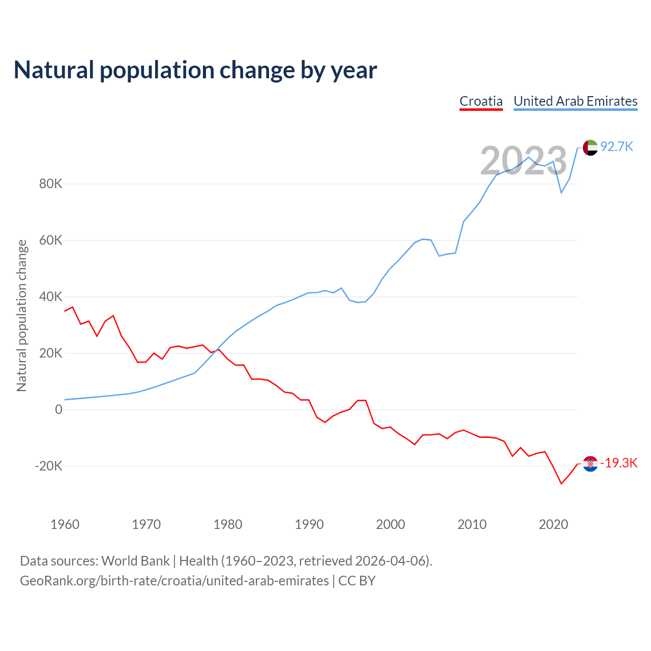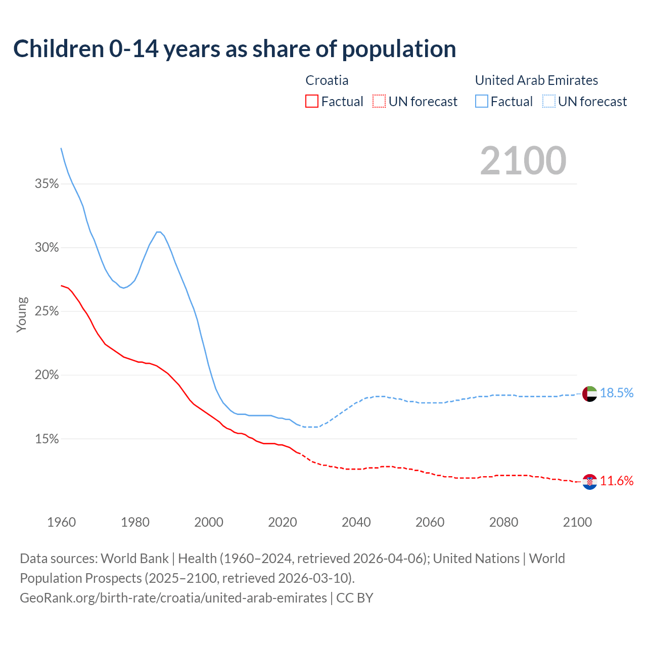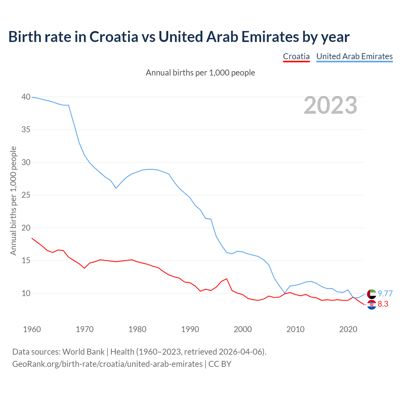 Croatia has an annual birth rate of 8.3 births per 1,000 people, compared to 9.77 for the United Arab Emirates. The average number of children a woman is expected to have during her lifetime — the fertility rate, is 1.46 in Croatia and 1.2 in the United Arab Emirates — 17.8% difference.