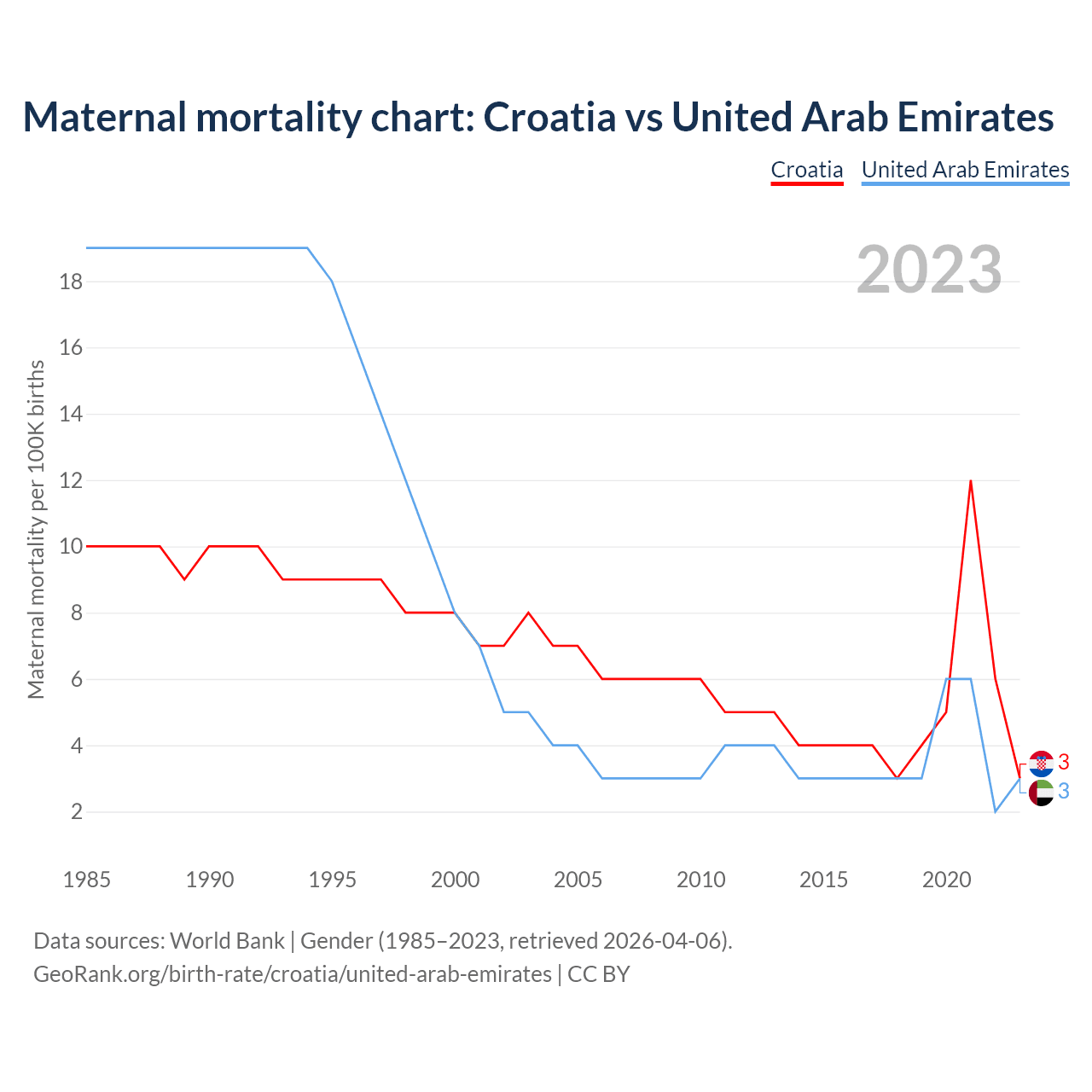 The maternal mortality rate, which is the probability of dying during childbirth or within 42 days of pregnancy termination, is 3 deaths per 100,000 live births in Croatia, compared to 3 deaths in the United Arab Emirates.