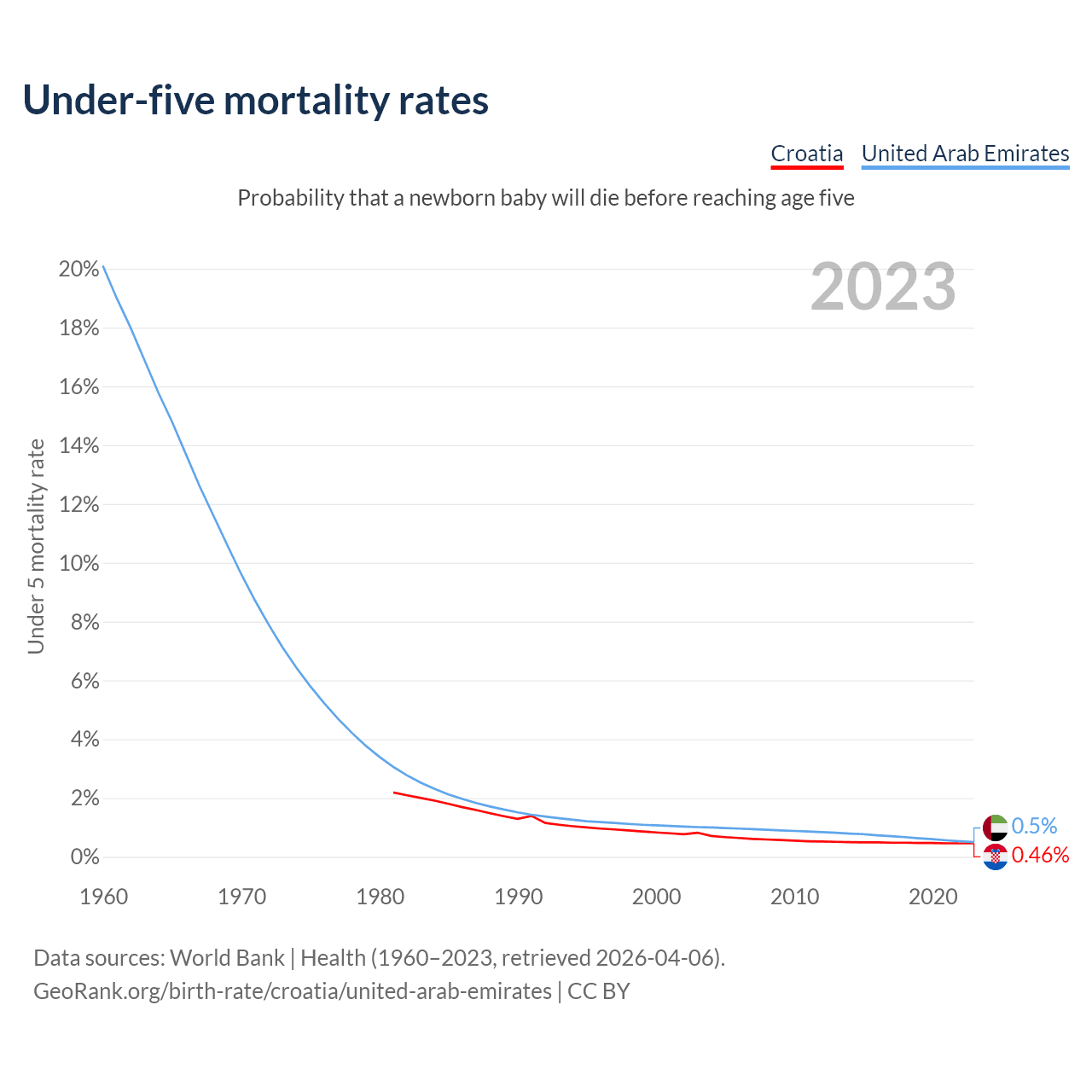The chance that a newborn baby will die before reaching age five is 0.46% in Croatia and 0.5% in the United Arab Emirates. Above is a chart with historical data on under-five mortality rates.