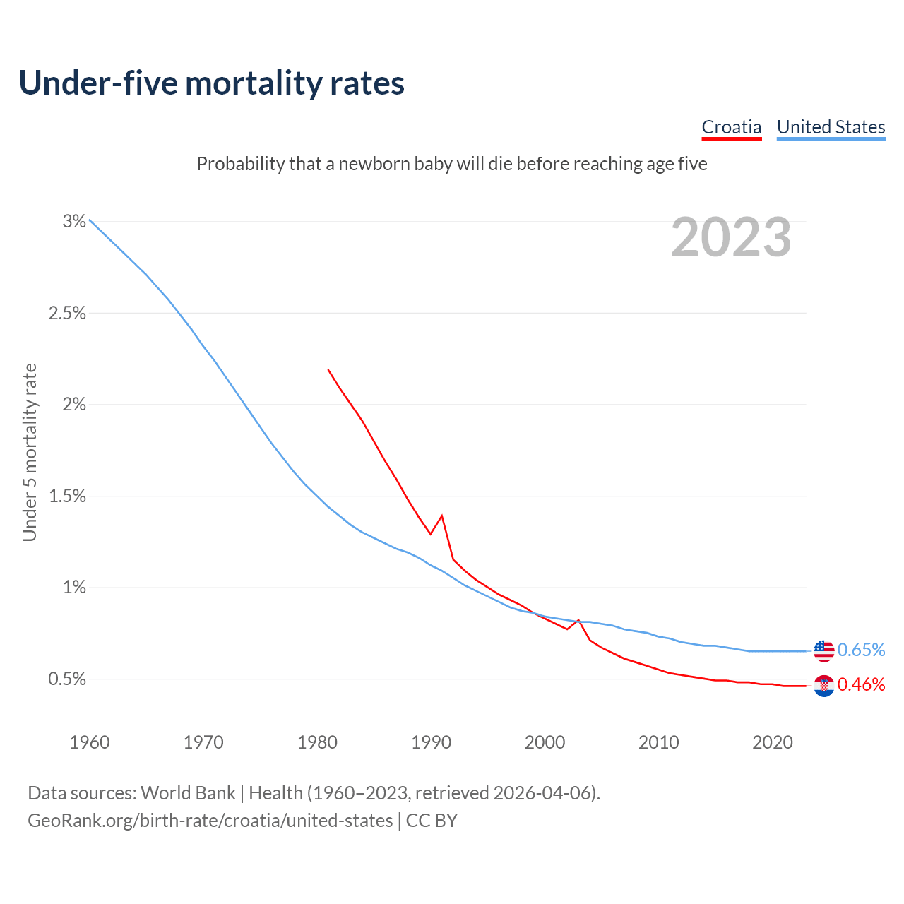 The chance that a newborn baby will die before reaching age five is 0.46% in Croatia and 0.65% in the United States. Above is a chart with historical data on under-five mortality rates.