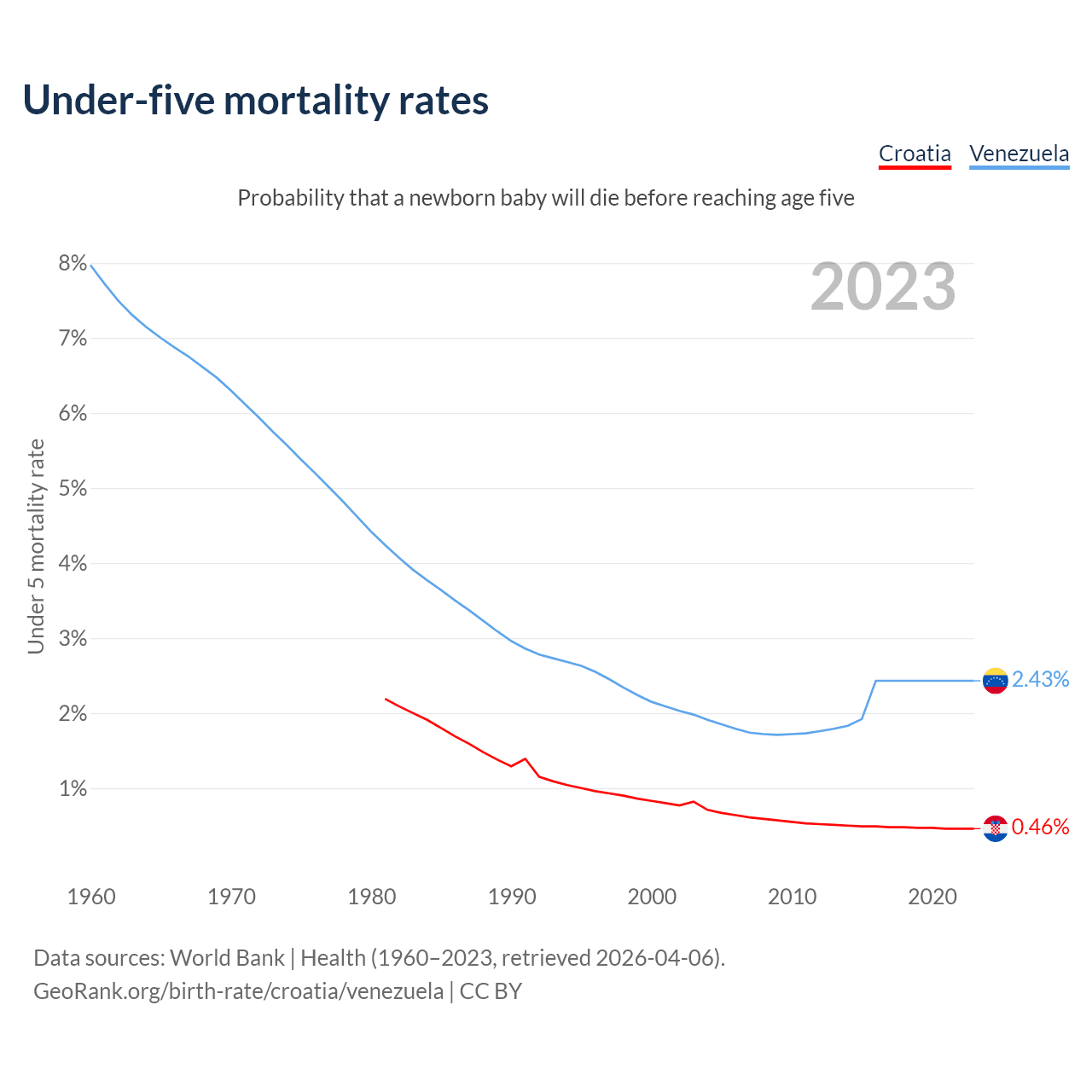 The chance that a newborn baby will die before reaching age five is 0.46% in Croatia and 2.43% in Venezuela. Above is a chart with historical data on under-five mortality rates.