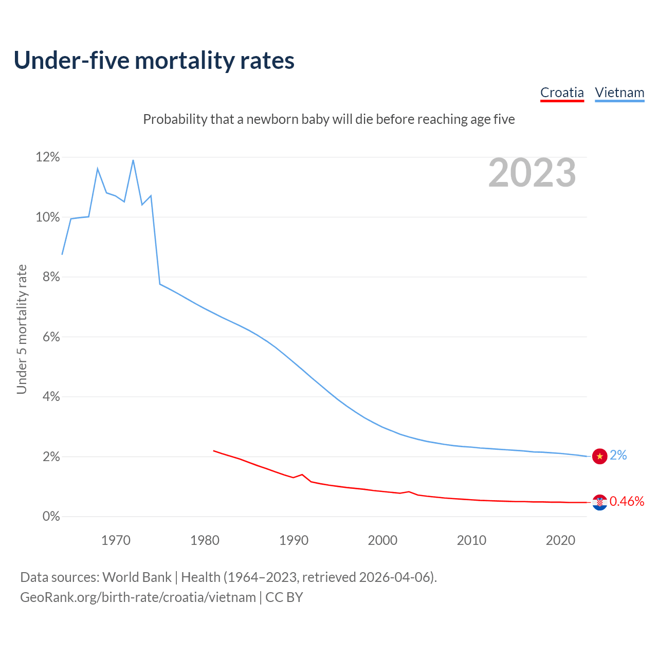 The chance that a newborn baby will die before reaching age five is 0.46% in Croatia and 2% in Vietnam. Above is a chart with historical data on under-five mortality rates.