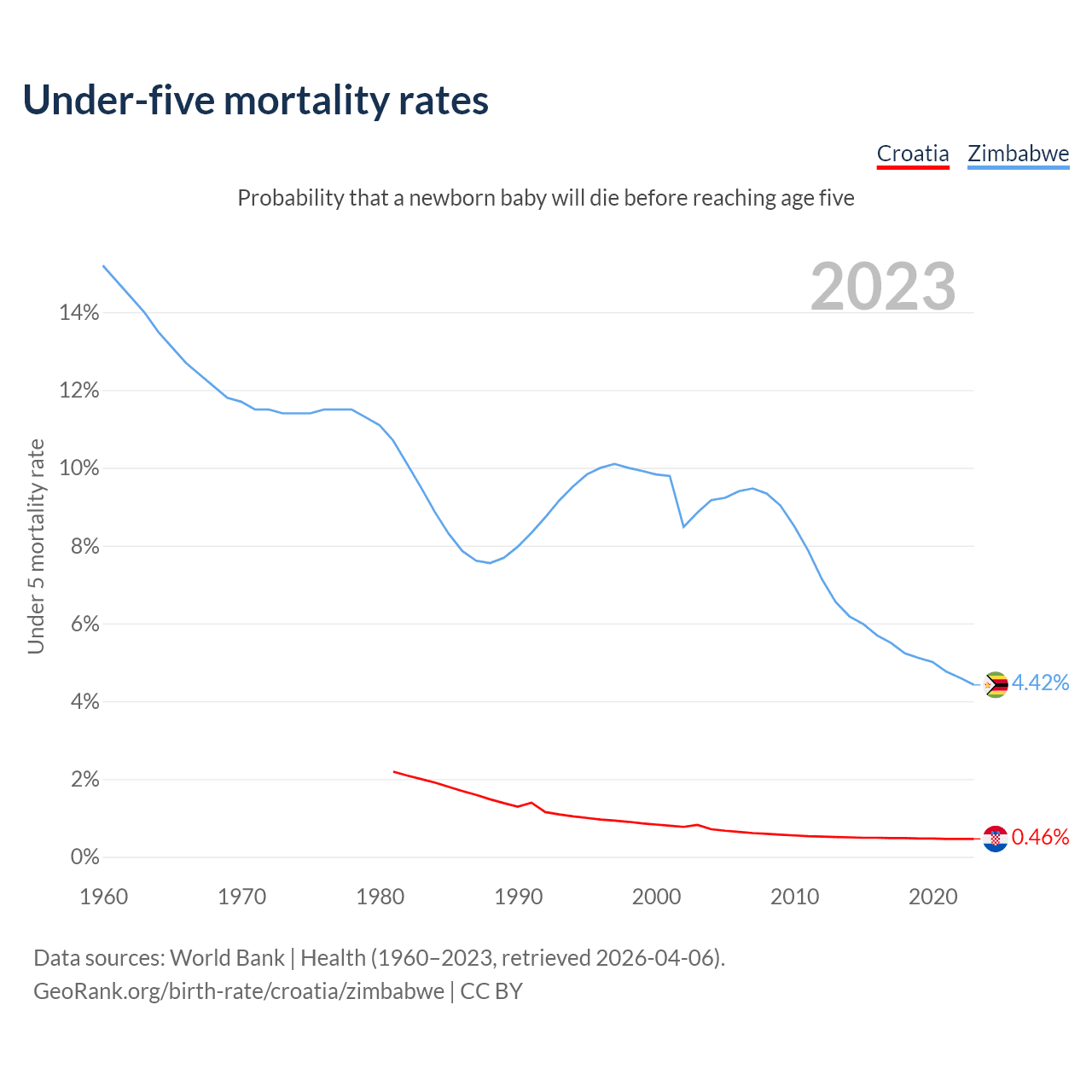 The chance that a newborn baby will die before reaching age five is 0.46% in Croatia and 4.42% in Zimbabwe. Above is a chart with historical data on under-five mortality rates.