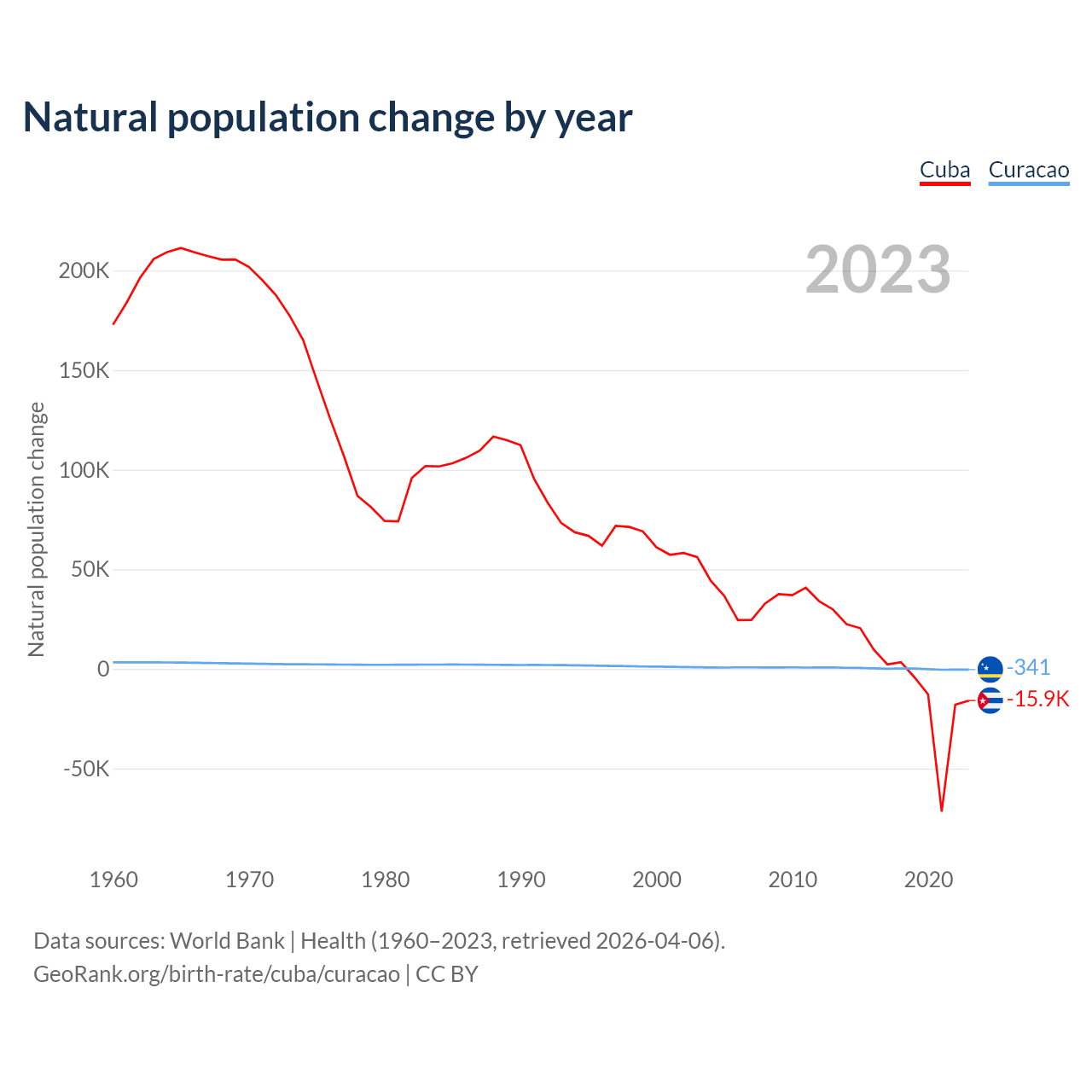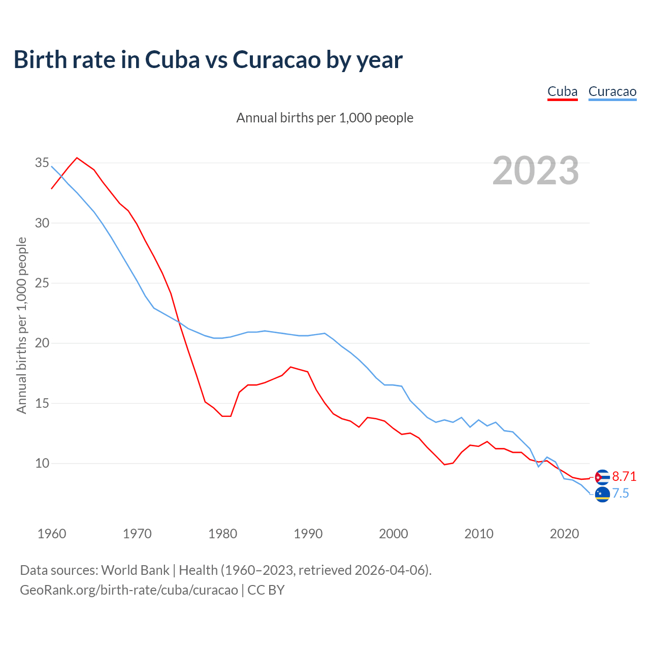 According to the latest available data on birth rates, the fertility rate in Cuba was 1.44 children per woman in 2023, compared to 1.2 in Curacao in 2023. The replacement level is considered to be 2.1 children per woman.
