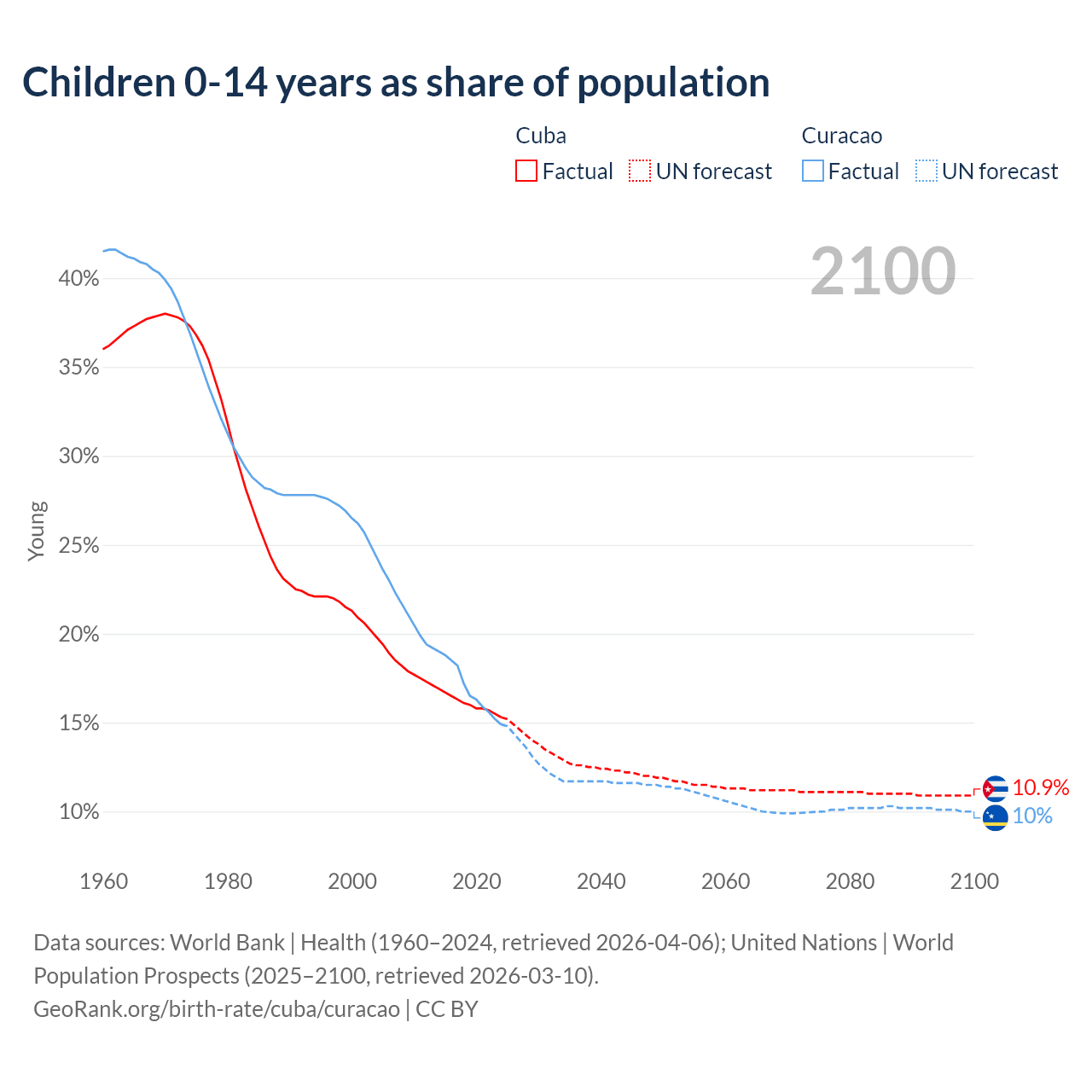 Children aged 0-14 make up 15.3% of the population in Cuba and 14.9% in Curacao in 2024, compared to 22.8% and 27.8% respectively in 1990.