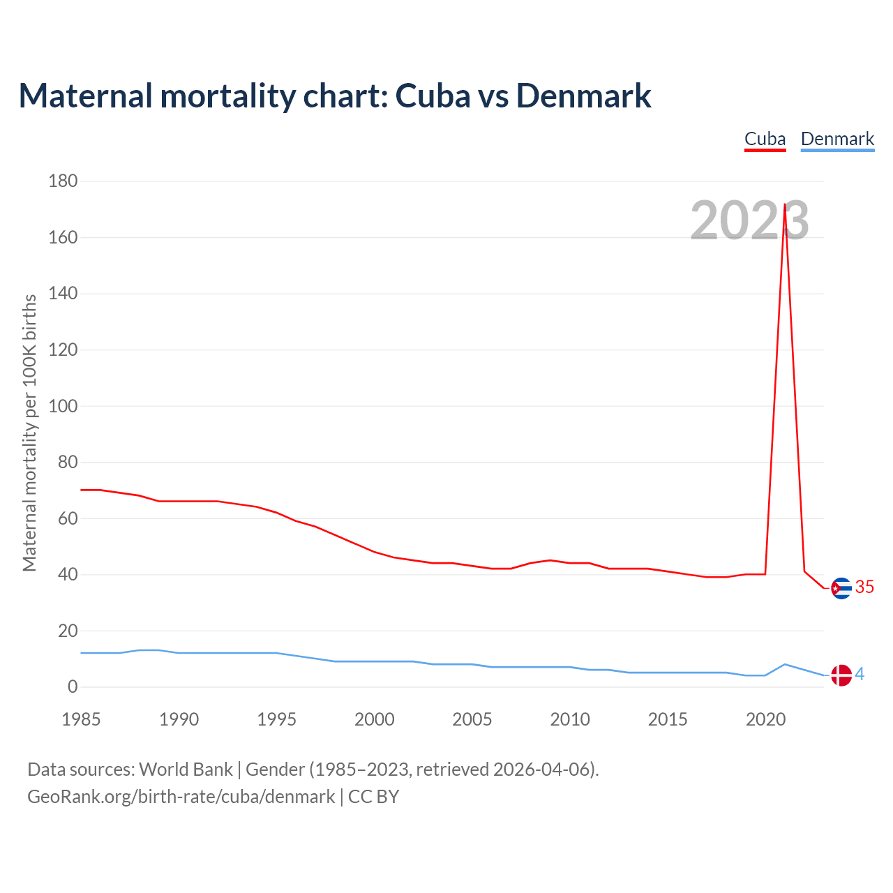 The maternal mortality rate, which is the probability of dying during childbirth or within 42 days of pregnancy termination, is 35 deaths per 100,000 live births in Cuba, compared to 4 deaths in Denmark.