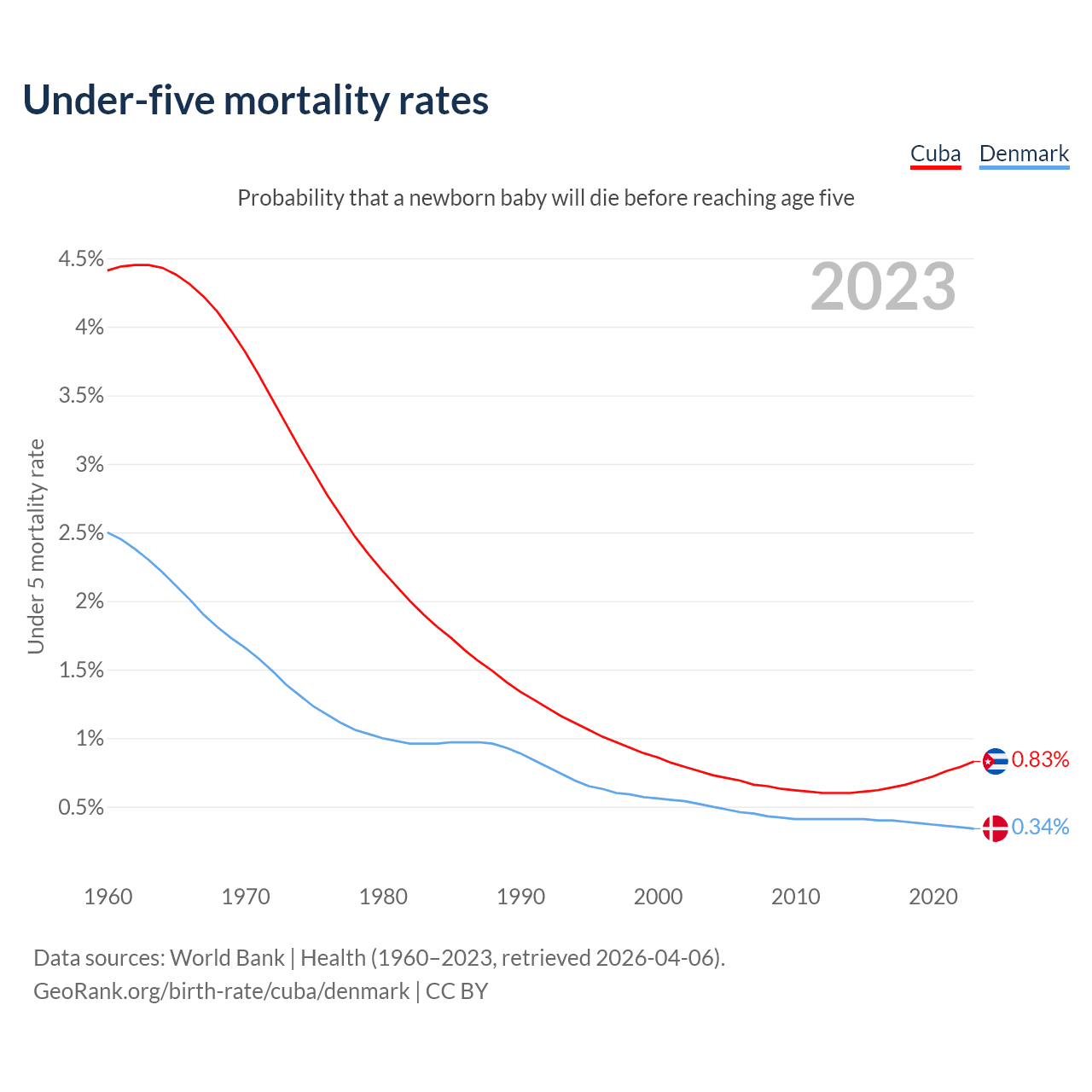 The chance that a newborn baby will die before reaching age five is 0.83% in Cuba and 0.34% in Denmark. Above is a chart with historical data on under-five mortality rates.