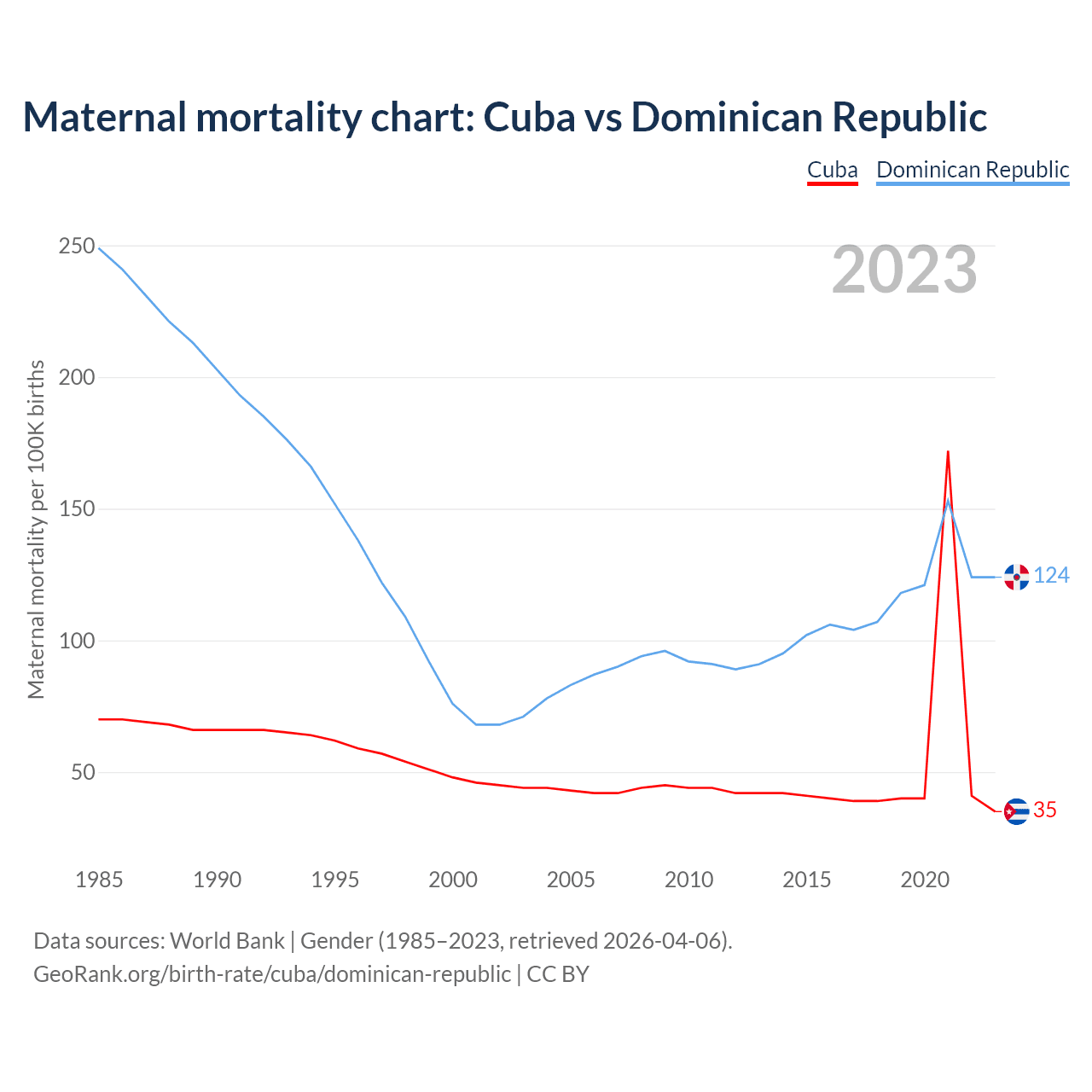 The maternal mortality rate, which is the probability of dying during childbirth or within 42 days of pregnancy termination, is 35 deaths per 100,000 live births in Cuba, compared to 124 deaths in the Dominican Republic.