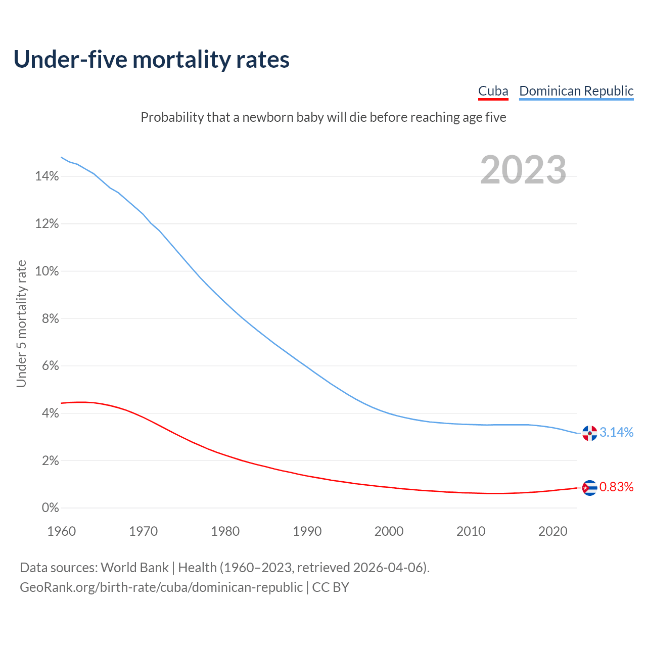 The chance that a newborn baby will die before reaching age five is 0.83% in Cuba and 3.14% in the Dominican Republic. Above is a chart with historical data on under-five mortality rates.