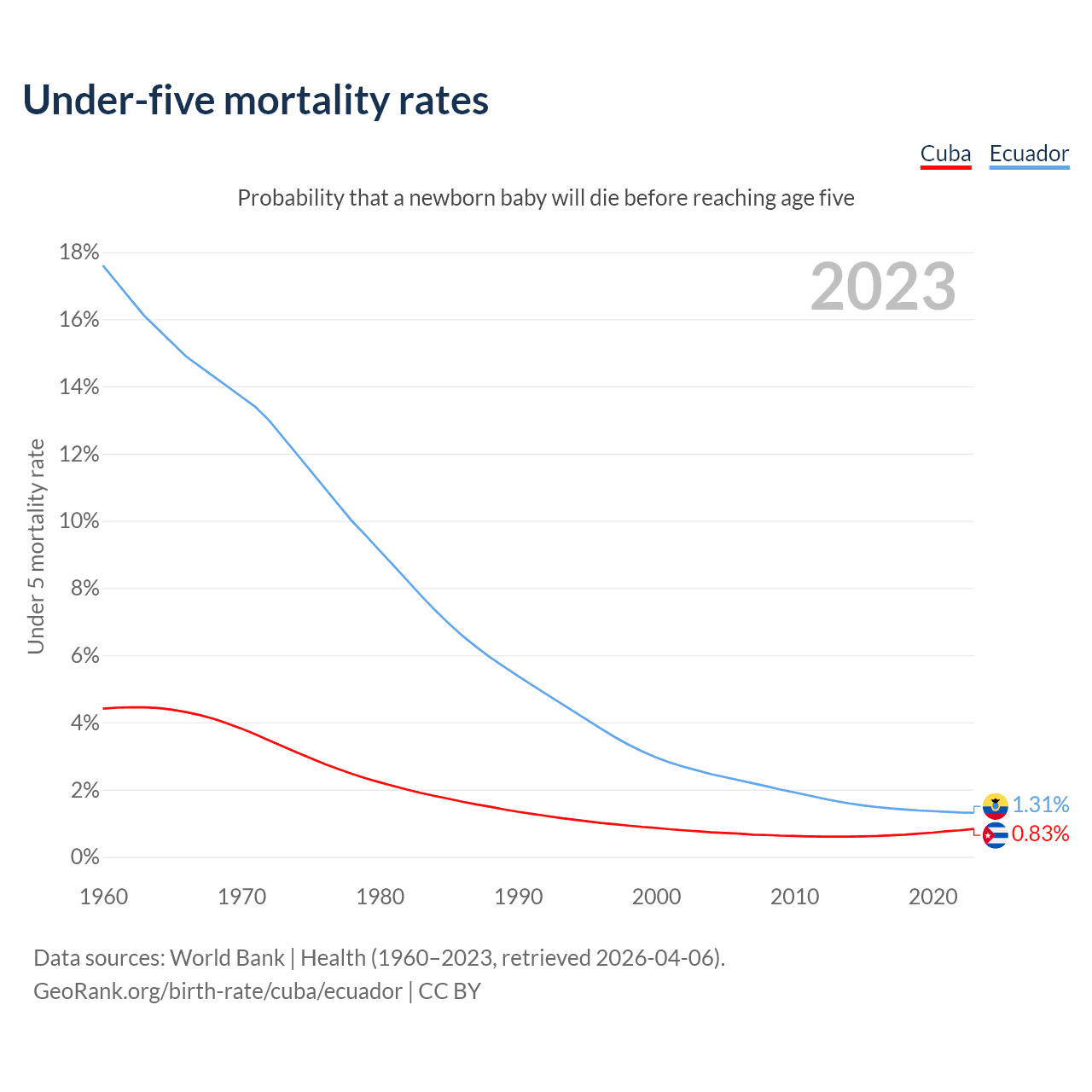 The chance that a newborn baby will die before reaching age five is 0.83% in Cuba and 1.31% in Ecuador. Above is a chart with historical data on under-five mortality rates.