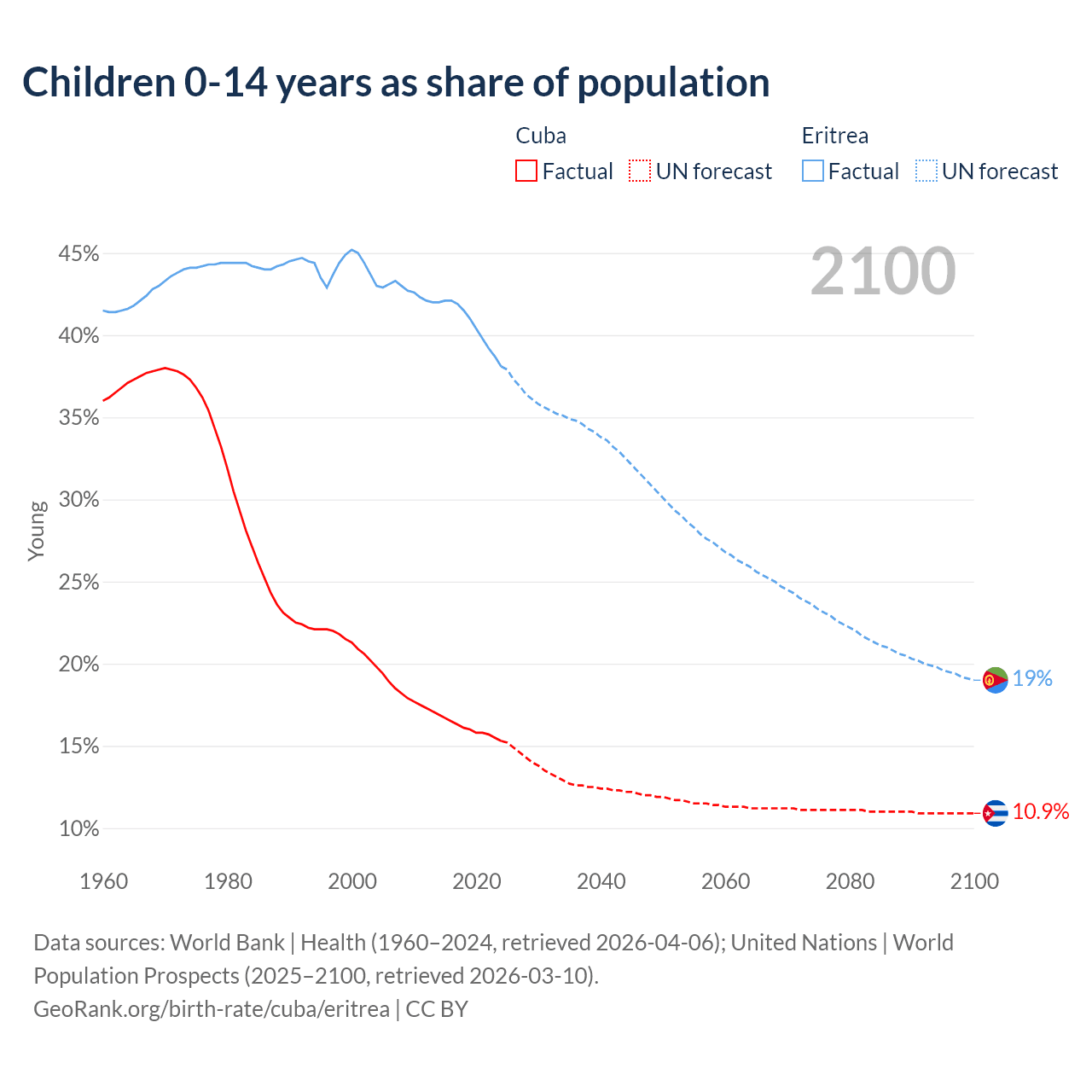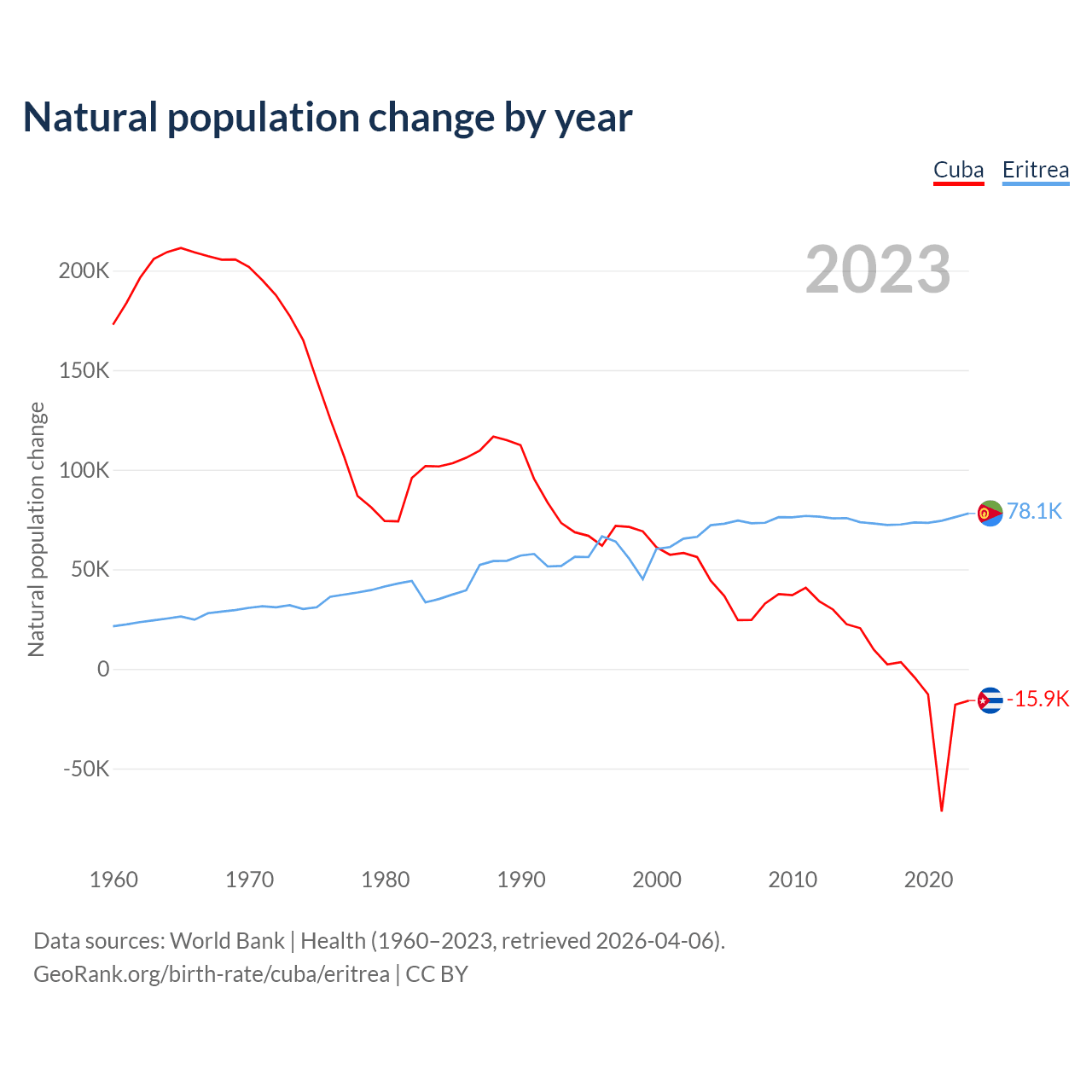 According to the latest available data on birth rates, the fertility rate in Cuba was 1.44 children per woman in 2023, compared to 3.71 in Eritrea in 2023. The replacement level is considered to be 2.1 children per woman.