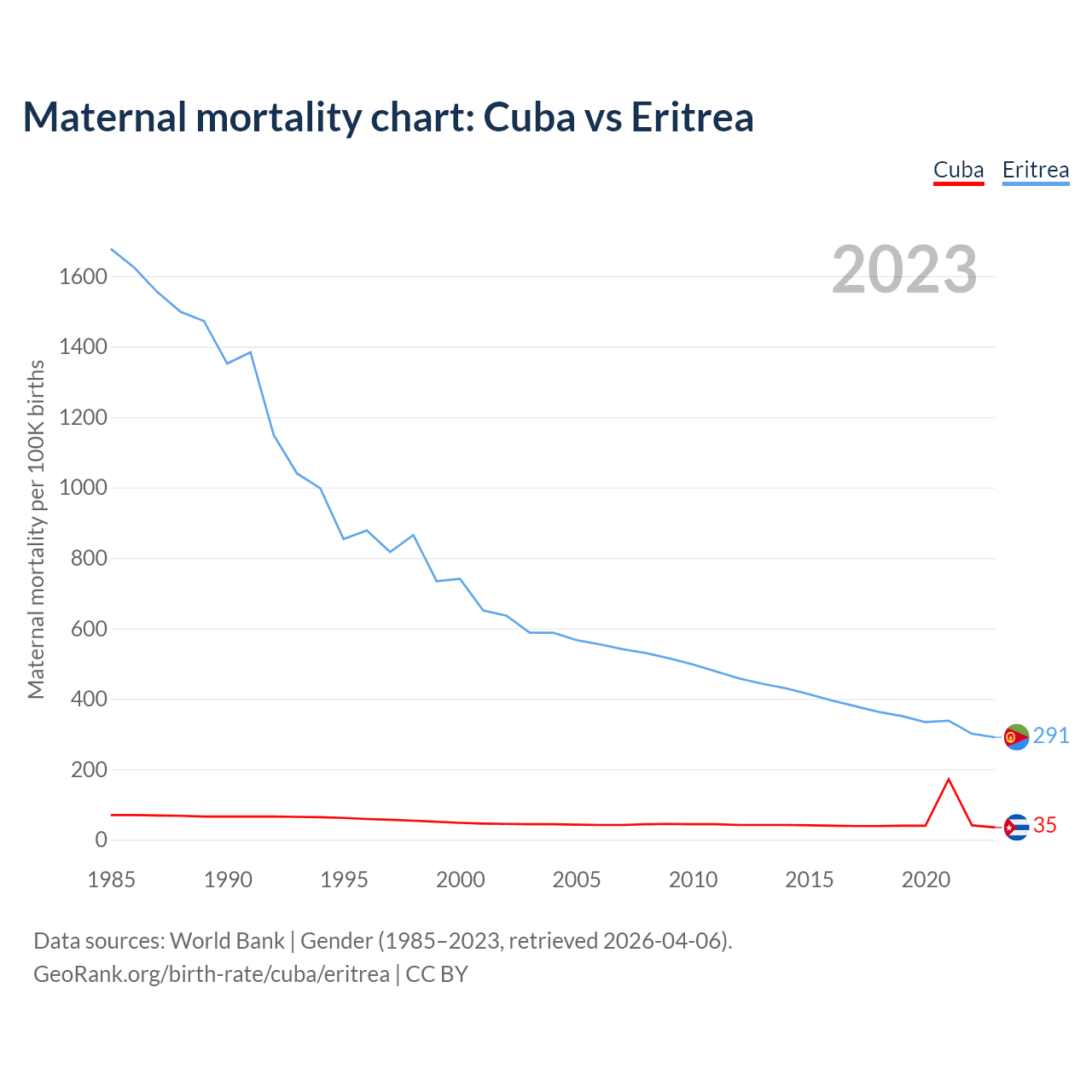 The maternal mortality rate, which is the probability of dying during childbirth or within 42 days of pregnancy termination, is 35 deaths per 100,000 live births in Cuba, compared to 291 deaths in Eritrea.