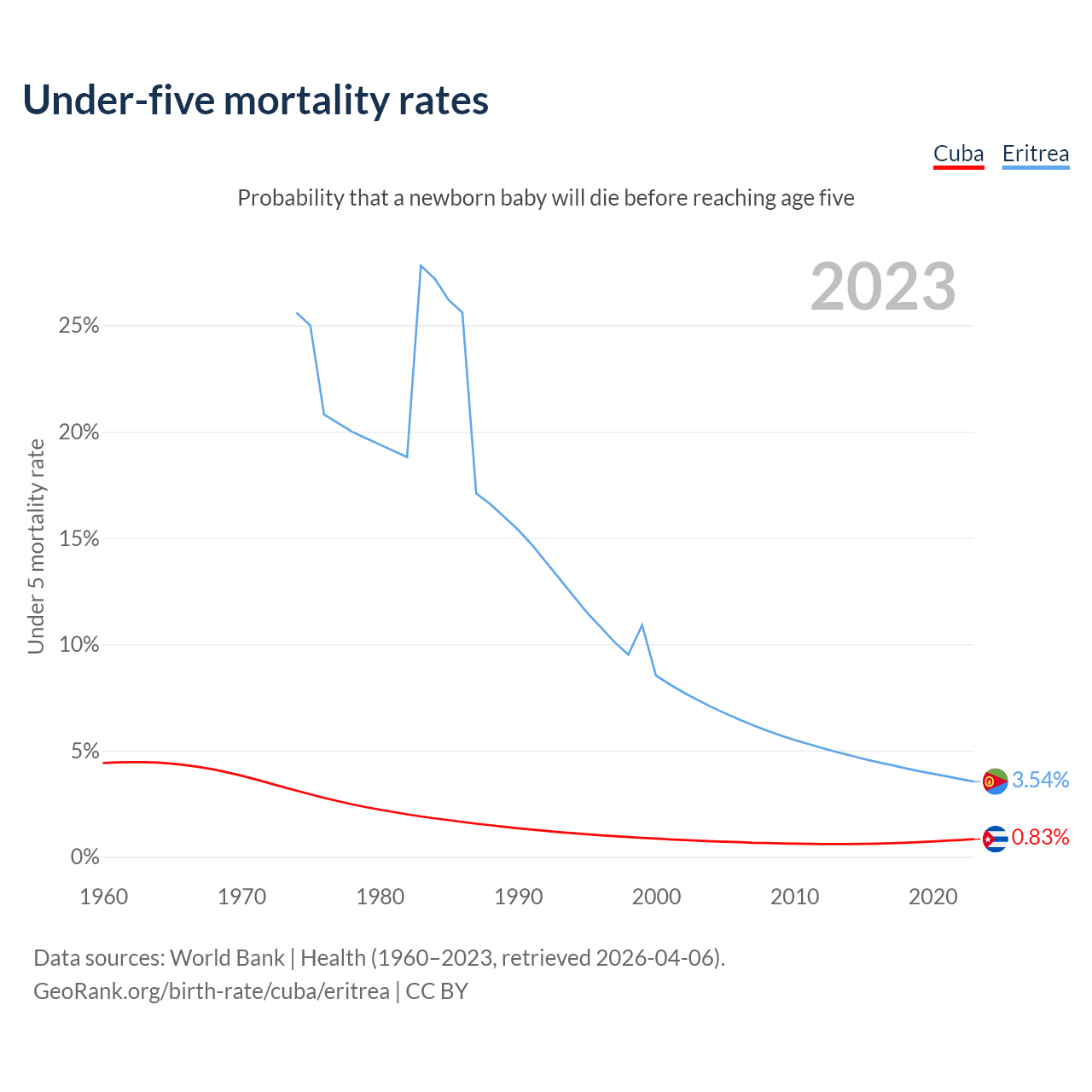 The chance that a newborn baby will die before reaching age five is 0.83% in Cuba and 3.54% in Eritrea. Above is a chart with historical data on under-five mortality rates.