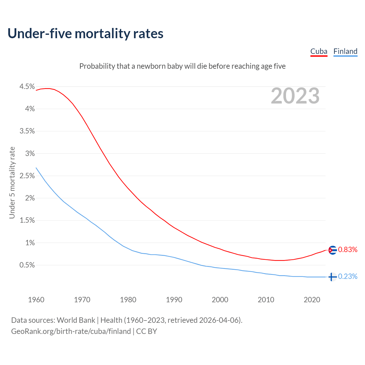 The chance that a newborn baby will die before reaching age five is 0.83% in Cuba and 0.23% in Finland. Above is a chart with historical data on under-five mortality rates.