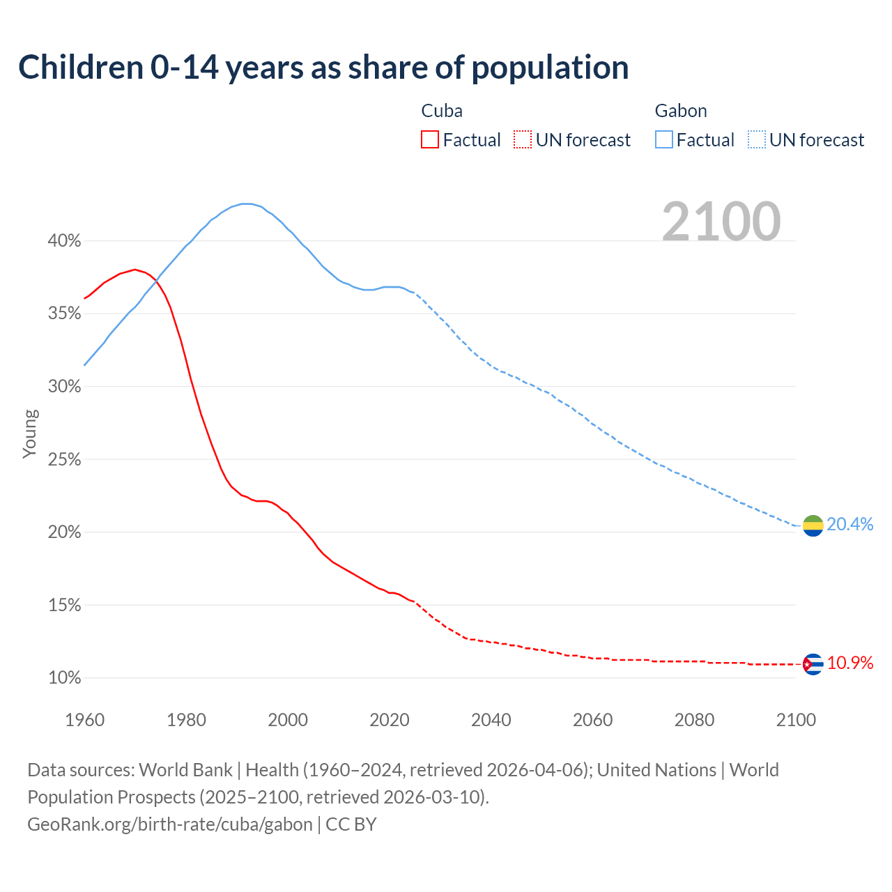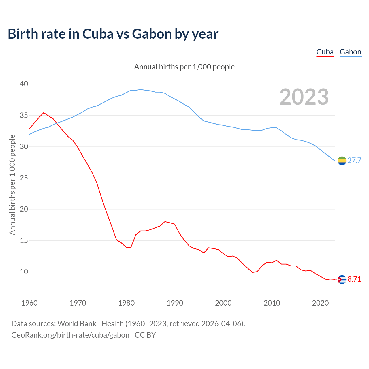 Cuba has an annual birth rate of 8.71 births per 1,000 people, compared to 27.7 for Gabon. The average number of children a woman is expected to have during her lifetime — the fertility rate, is 1.44 in Cuba and 3.65 in Gabon — 153.4% difference.