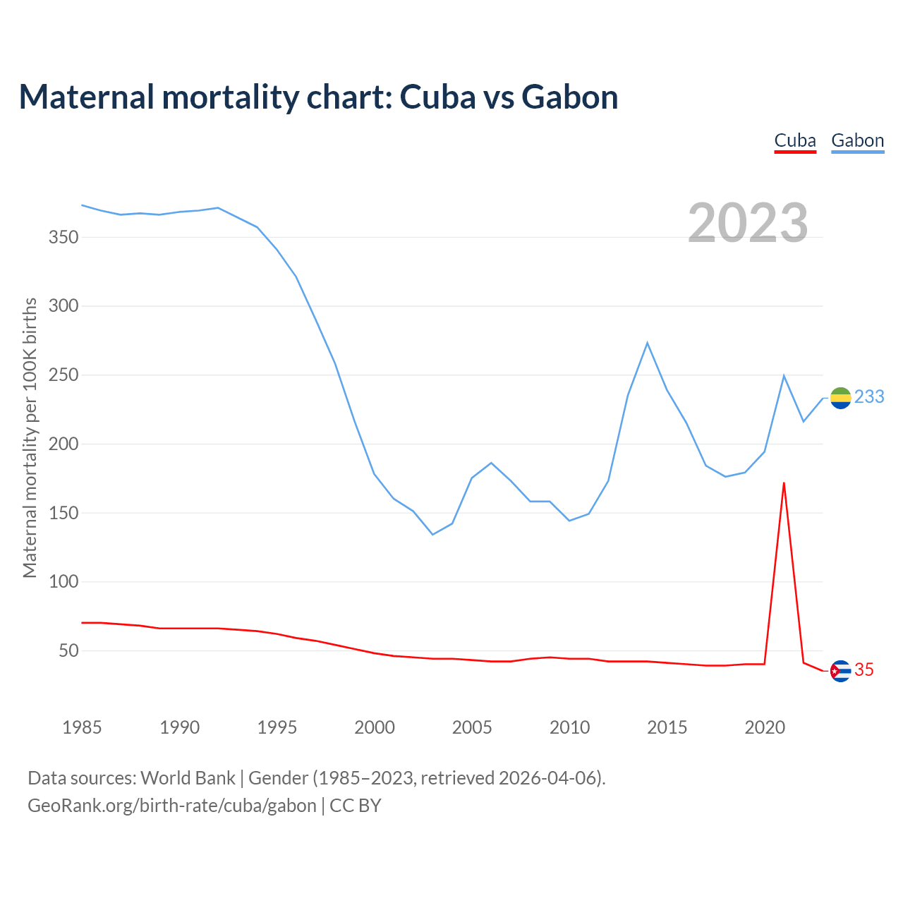 The maternal mortality rate, which is the probability of dying during childbirth or within 42 days of pregnancy termination, is 35 deaths per 100,000 live births in Cuba, compared to 233 deaths in Gabon.