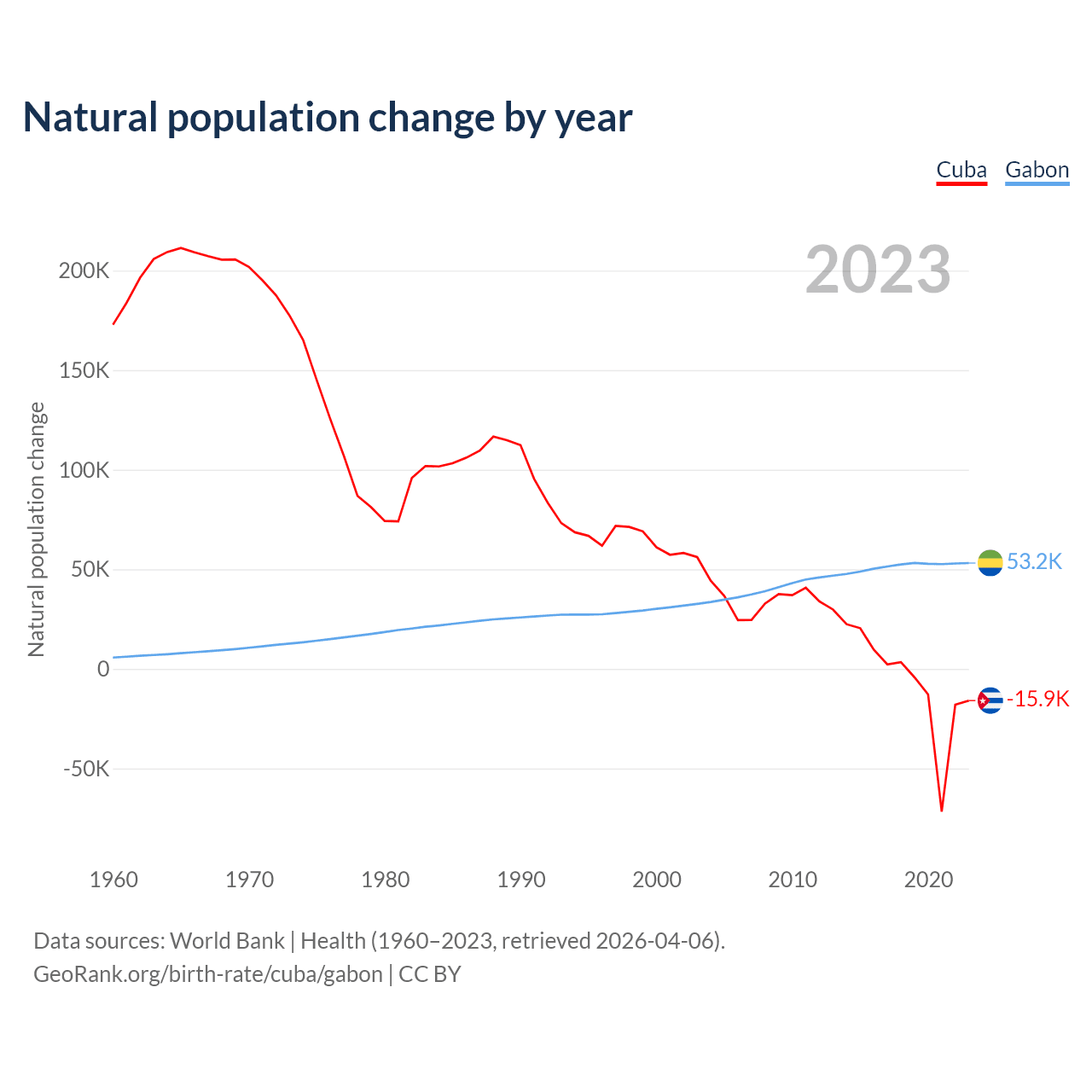 According to the latest available data on birth rates, the fertility rate in Cuba was 1.44 children per woman in 2023, compared to 3.65 in Gabon in 2023. The replacement level is considered to be 2.1 children per woman.