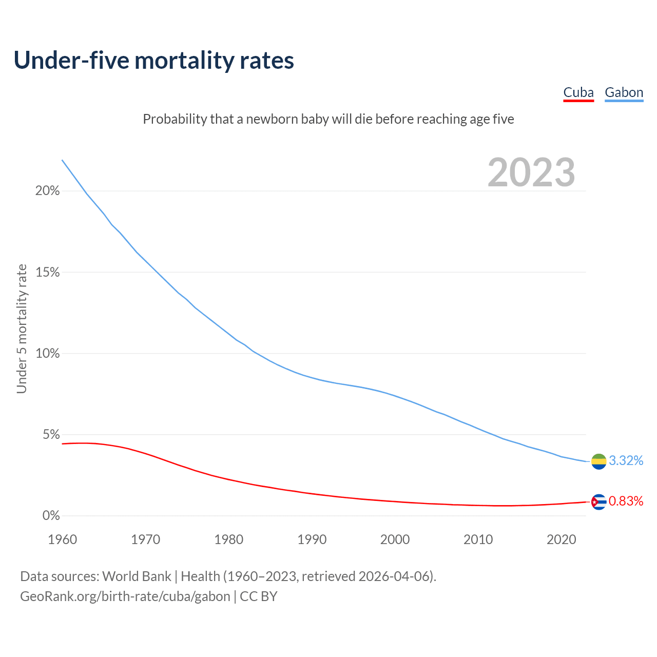 The chance that a newborn baby will die before reaching age five is 0.83% in Cuba and 3.32% in Gabon. Above is a chart with historical data on under-five mortality rates.