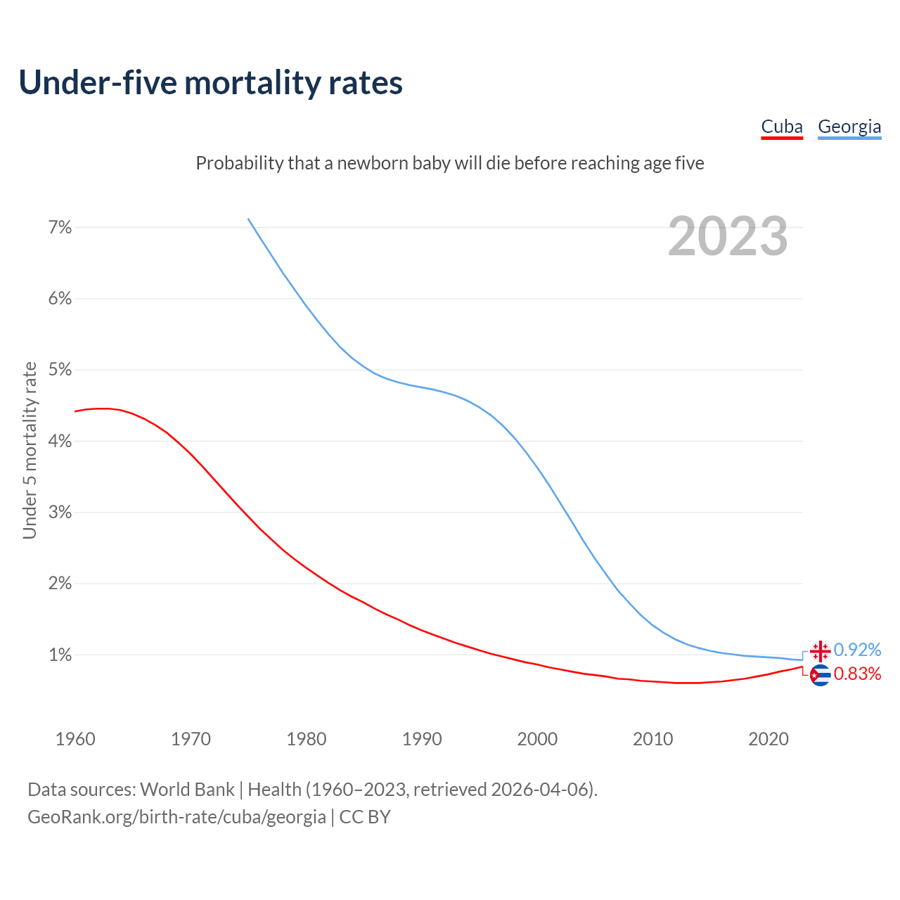 The chance that a newborn baby will die before reaching age five is 0.83% in Cuba and 0.92% in Georgia. Above is a chart with historical data on under-five mortality rates.