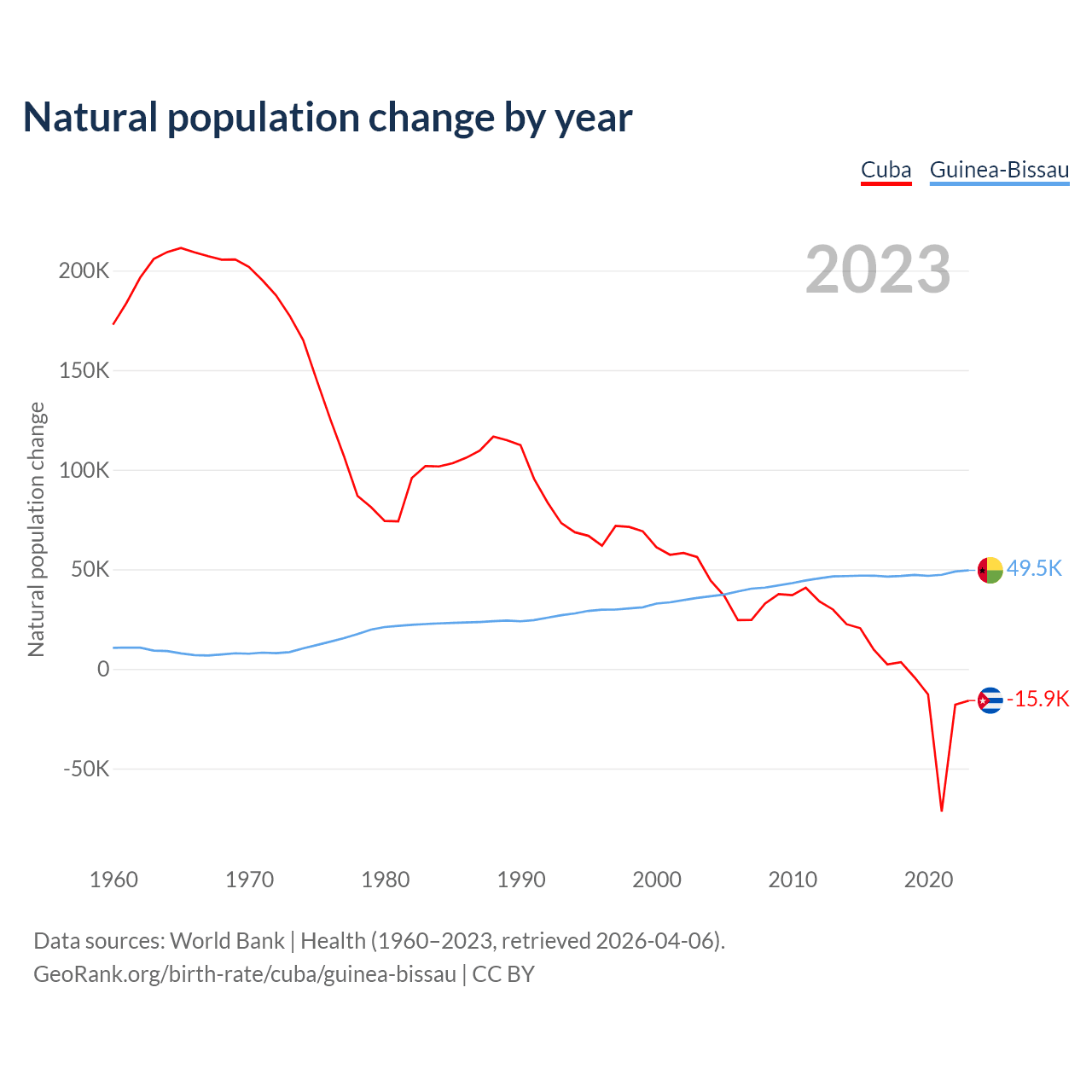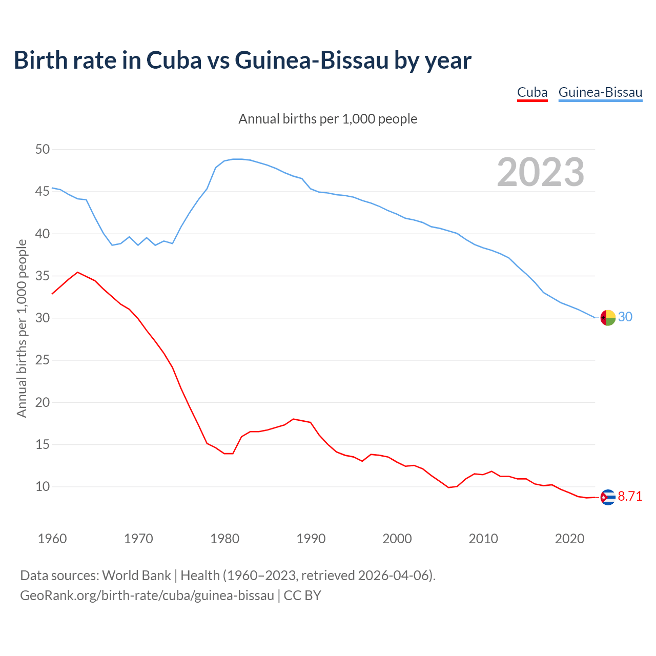 Cuba has an annual birth rate of 8.71 births per 1,000 people, compared to 30 for Guinea-Bissau. The average number of children a woman is expected to have during her lifetime — the fertility rate, is 1.44 in Cuba and 3.84 in Guinea-Bissau — 166.6% difference.