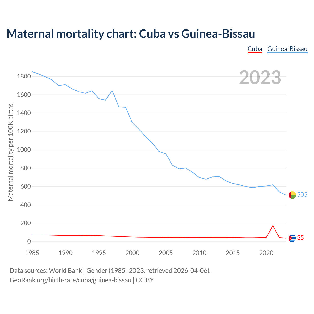The maternal mortality rate, which is the probability of dying during childbirth or within 42 days of pregnancy termination, is 35 deaths per 100,000 live births in Cuba, compared to 505 deaths in Guinea-Bissau.