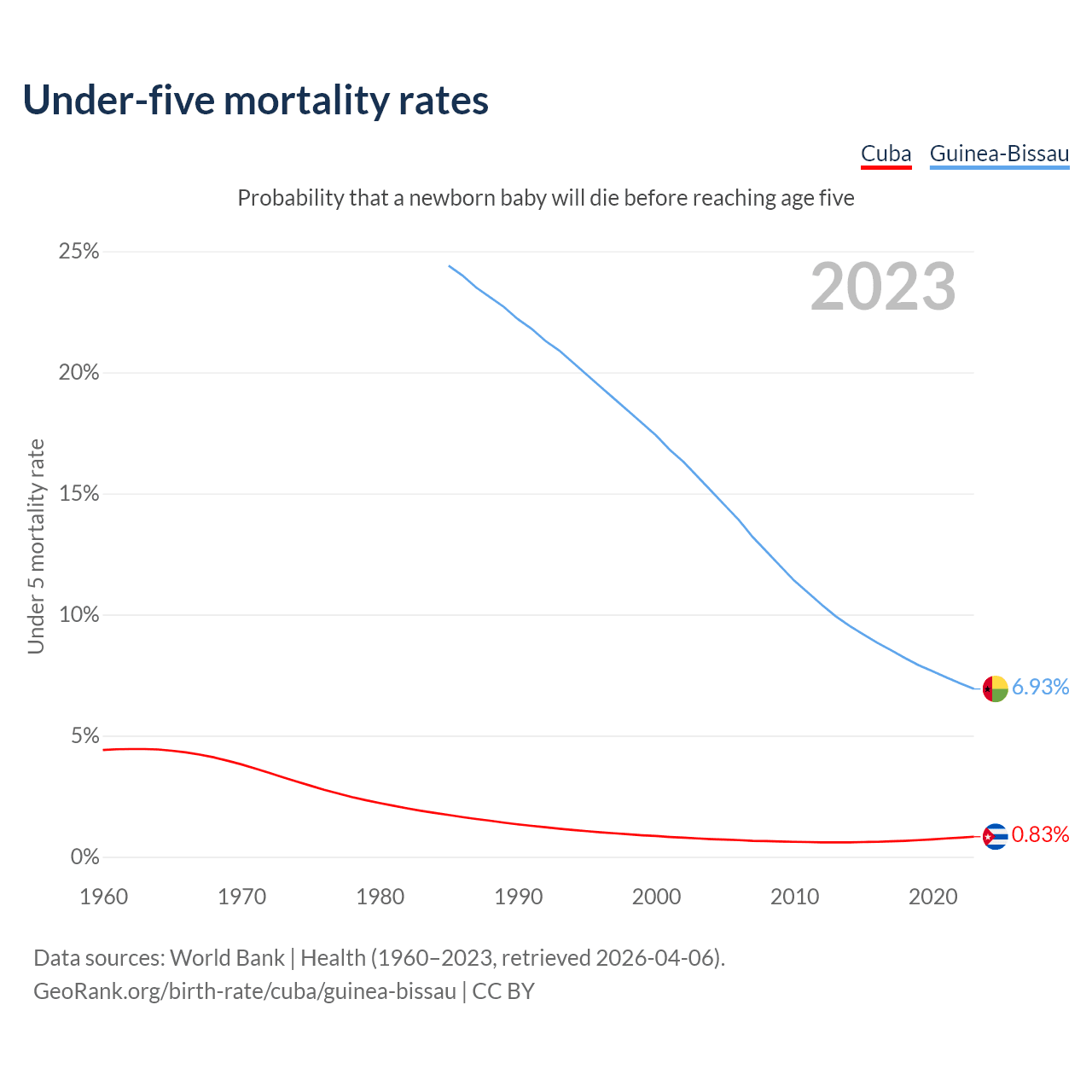 The chance that a newborn baby will die before reaching age five is 0.83% in Cuba and 6.93% in Guinea-Bissau. Above is a chart with historical data on under-five mortality rates.