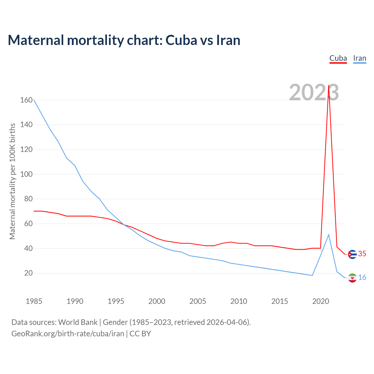 The maternal mortality rate, which is the probability of dying during childbirth or within 42 days of pregnancy termination, is 35 deaths per 100,000 live births in Cuba, compared to 16 deaths in Iran.