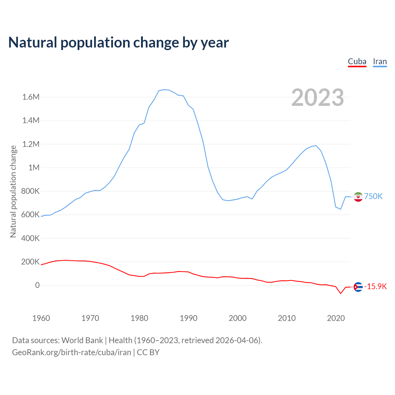 Cuba has an annual birth rate of 8.71 births per 1,000 people, compared to 13 for Iran. The average number of children a woman is expected to have during her lifetime — the fertility rate, is 1.44 in Cuba and 1.7 in Iran — 17.8% difference.