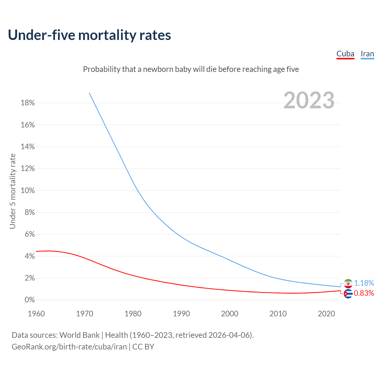 The chance that a newborn baby will die before reaching age five is 0.83% in Cuba and 1.18% in Iran. Above is a chart with historical data on under-five mortality rates.