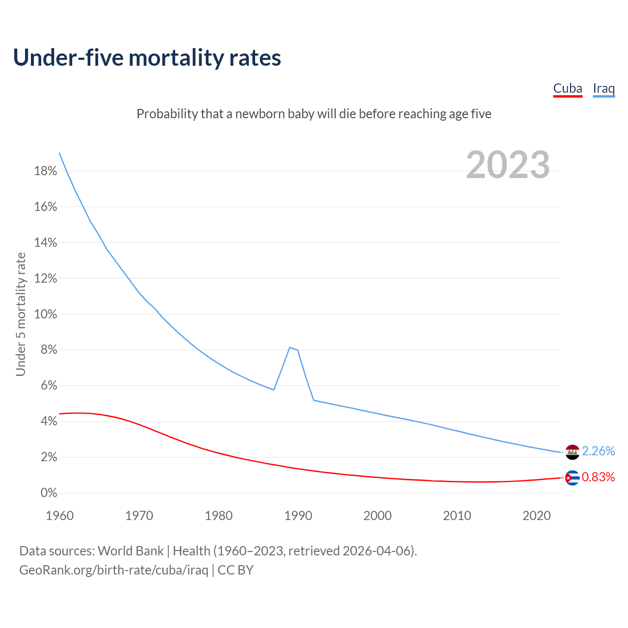 The chance that a newborn baby will die before reaching age five is 0.83% in Cuba and 2.26% in Iraq. Above is a chart with historical data on under-five mortality rates.