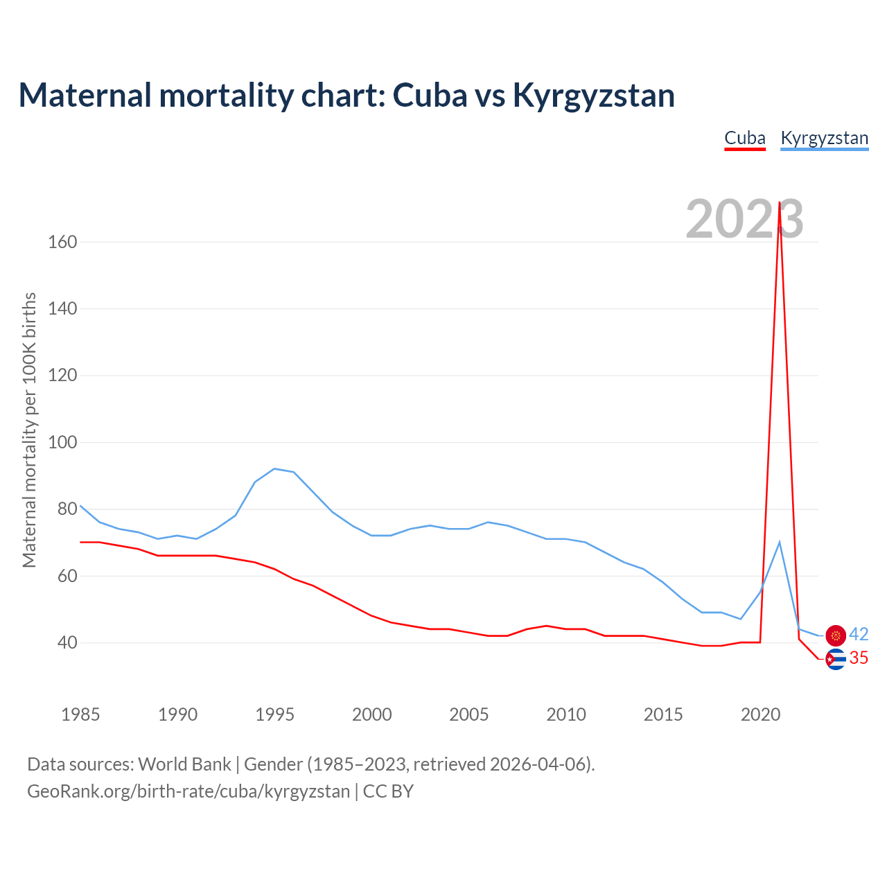 The maternal mortality rate, which is the probability of dying during childbirth or within 42 days of pregnancy termination, is 35 deaths per 100,000 live births in Cuba, compared to 42 deaths in Kyrgyzstan.