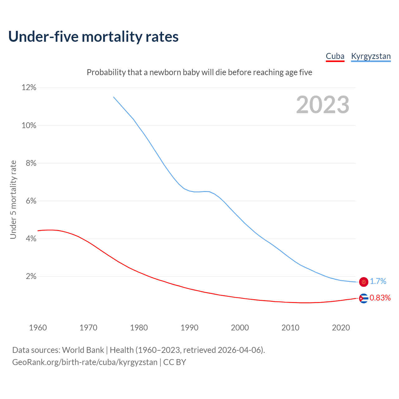 The chance that a newborn baby will die before reaching age five is 0.83% in Cuba and 1.7% in Kyrgyzstan. Above is a chart with historical data on under-five mortality rates.