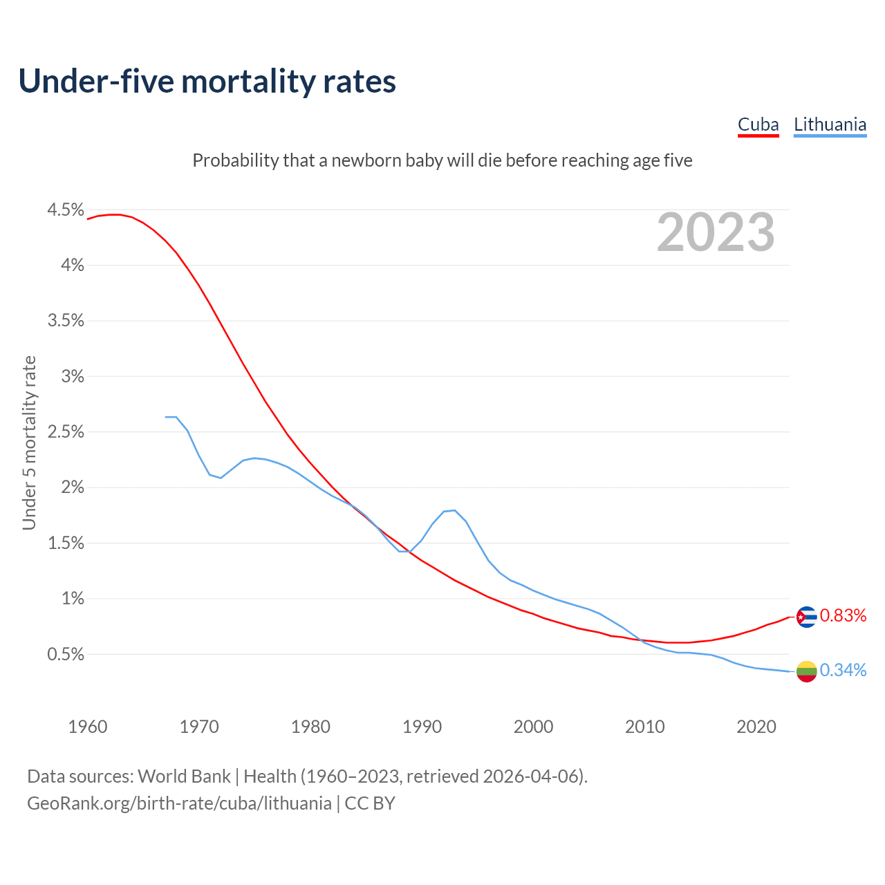 The chance that a newborn baby will die before reaching age five is 0.83% in Cuba and 0.34% in Lithuania. Above is a chart with historical data on under-five mortality rates.