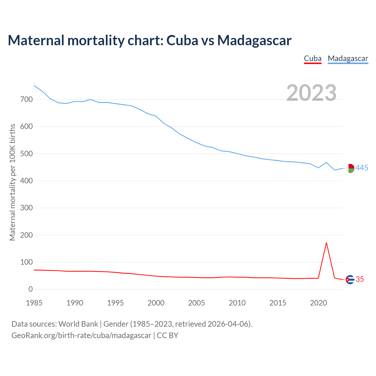 The maternal mortality rate, which is the probability of dying during childbirth or within 42 days of pregnancy termination, is 35 deaths per 100,000 live births in Cuba, compared to 445 deaths in Madagascar.