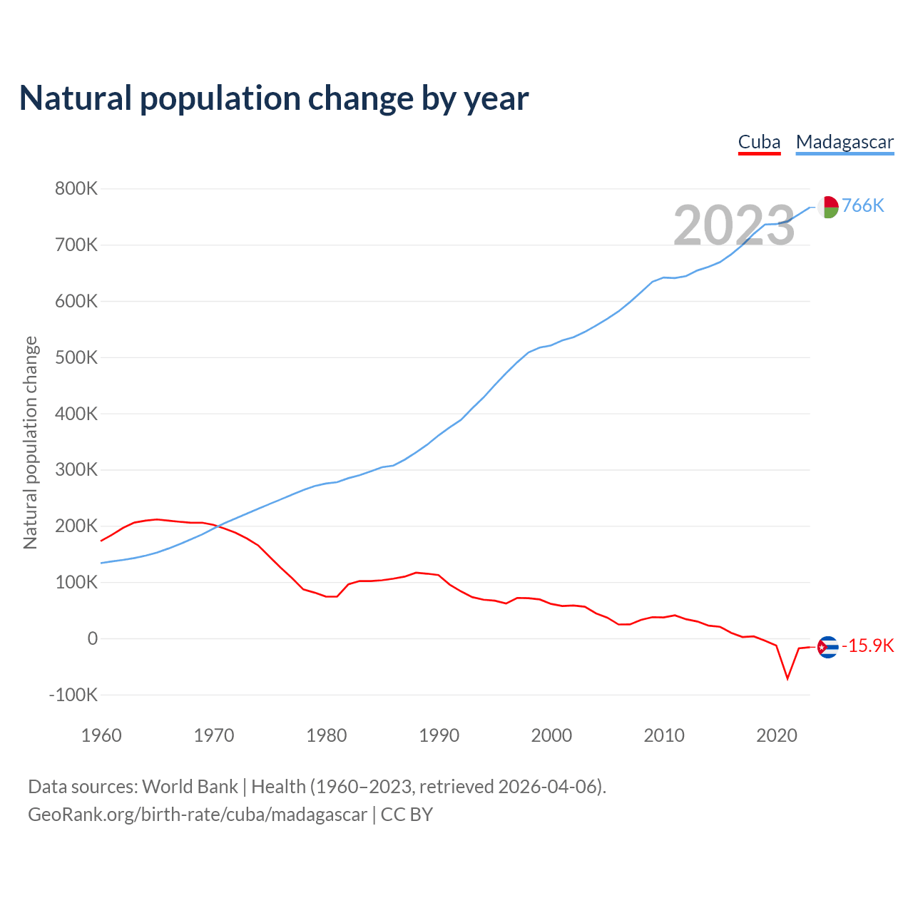 According to the latest available data on birth rates, the fertility rate in Cuba was 1.44 children per woman in 2023, compared to 3.97 in Madagascar in 2023. The replacement level is considered to be 2.1 children per woman.