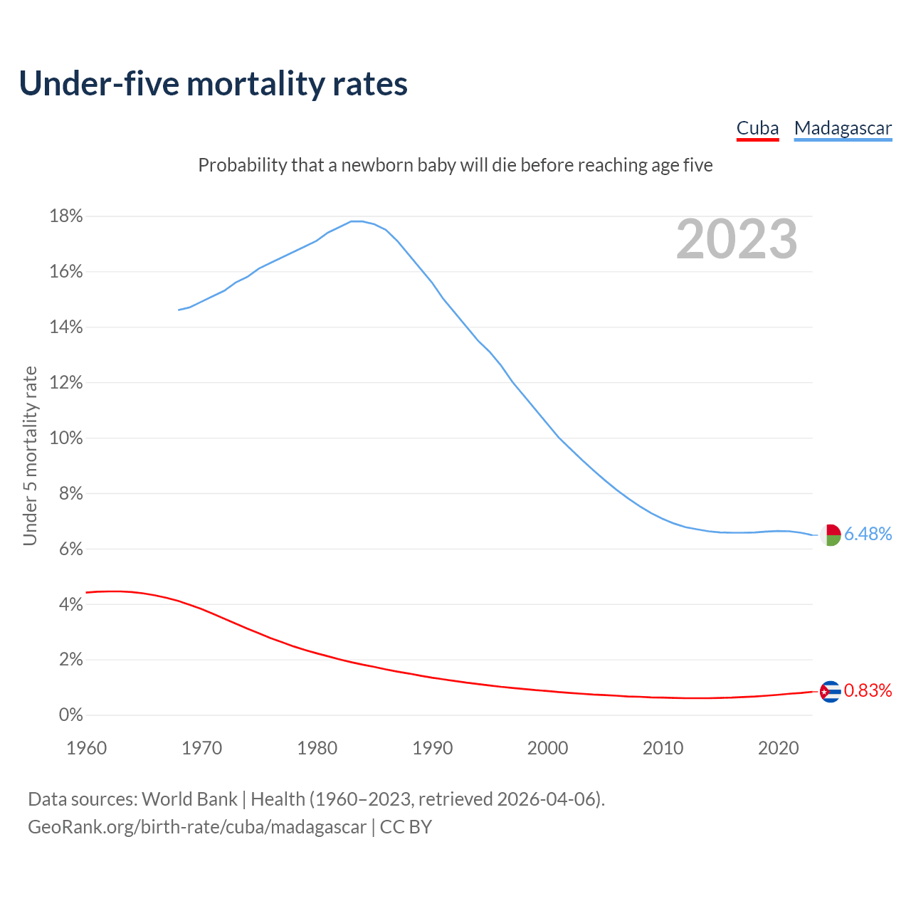 The chance that a newborn baby will die before reaching age five is 0.83% in Cuba and 6.48% in Madagascar. Above is a chart with historical data on under-five mortality rates.