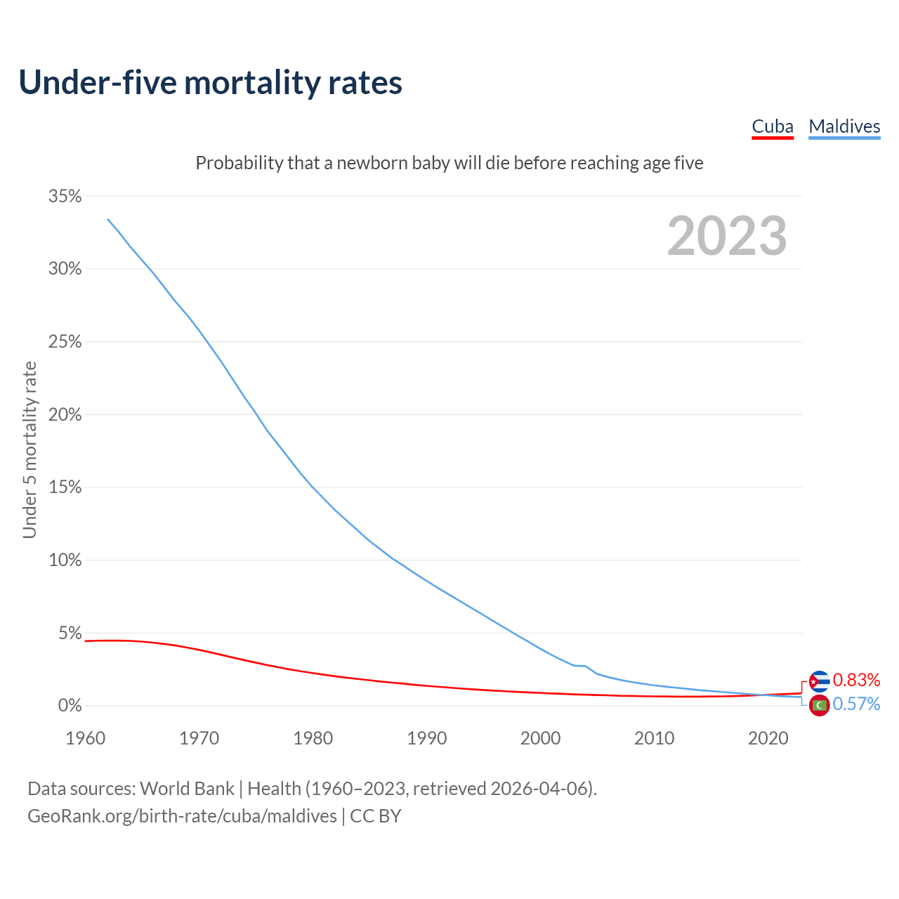 The chance that a newborn baby will die before reaching age five is 0.83% in Cuba and 0.57% in Maldives. Above is a chart with historical data on under-five mortality rates.