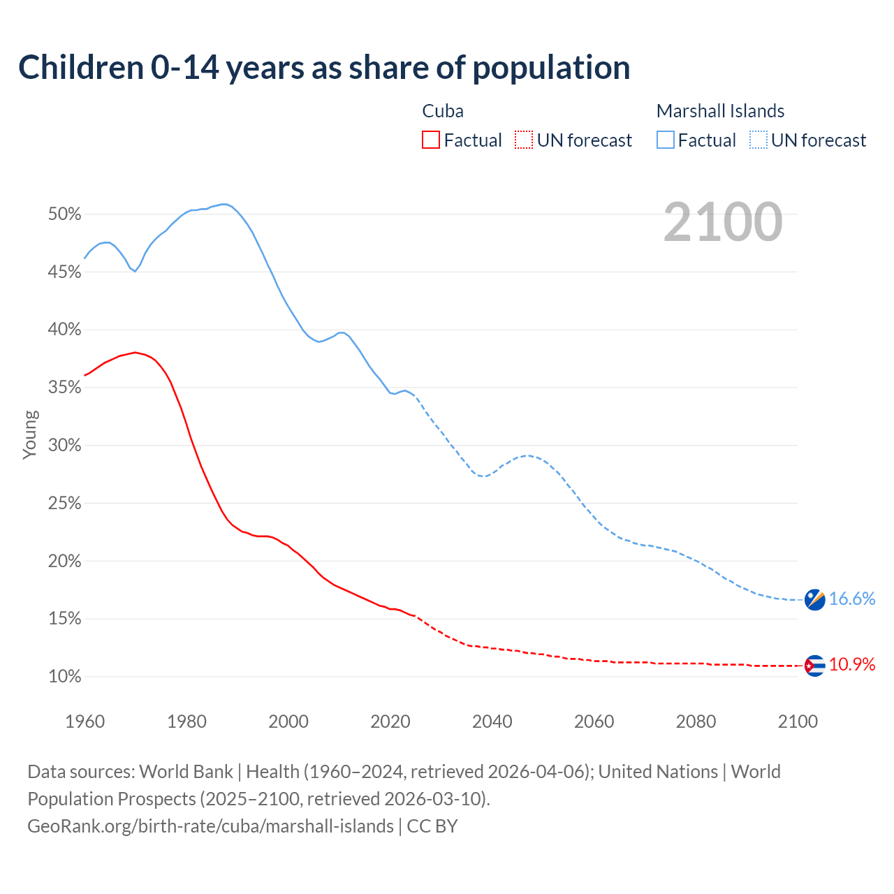 Cuba has an annual birth rate of 8.71 births per 1,000 people, compared to 21.1 for the Marshall Islands. The average number of children a woman is expected to have during her lifetime — the fertility rate, is 1.44 in Cuba and 2.92 in the Marshall Islands — 102.8% difference.