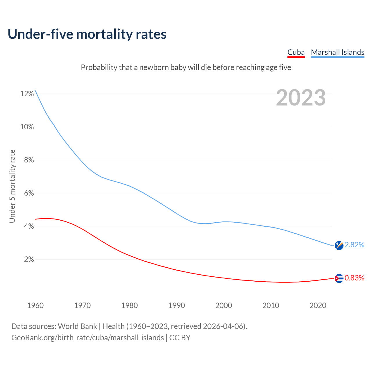 The chance that a newborn baby will die before reaching age five is 0.83% in Cuba and 2.82% in the Marshall Islands. Above is a chart with historical data on under-five mortality rates.