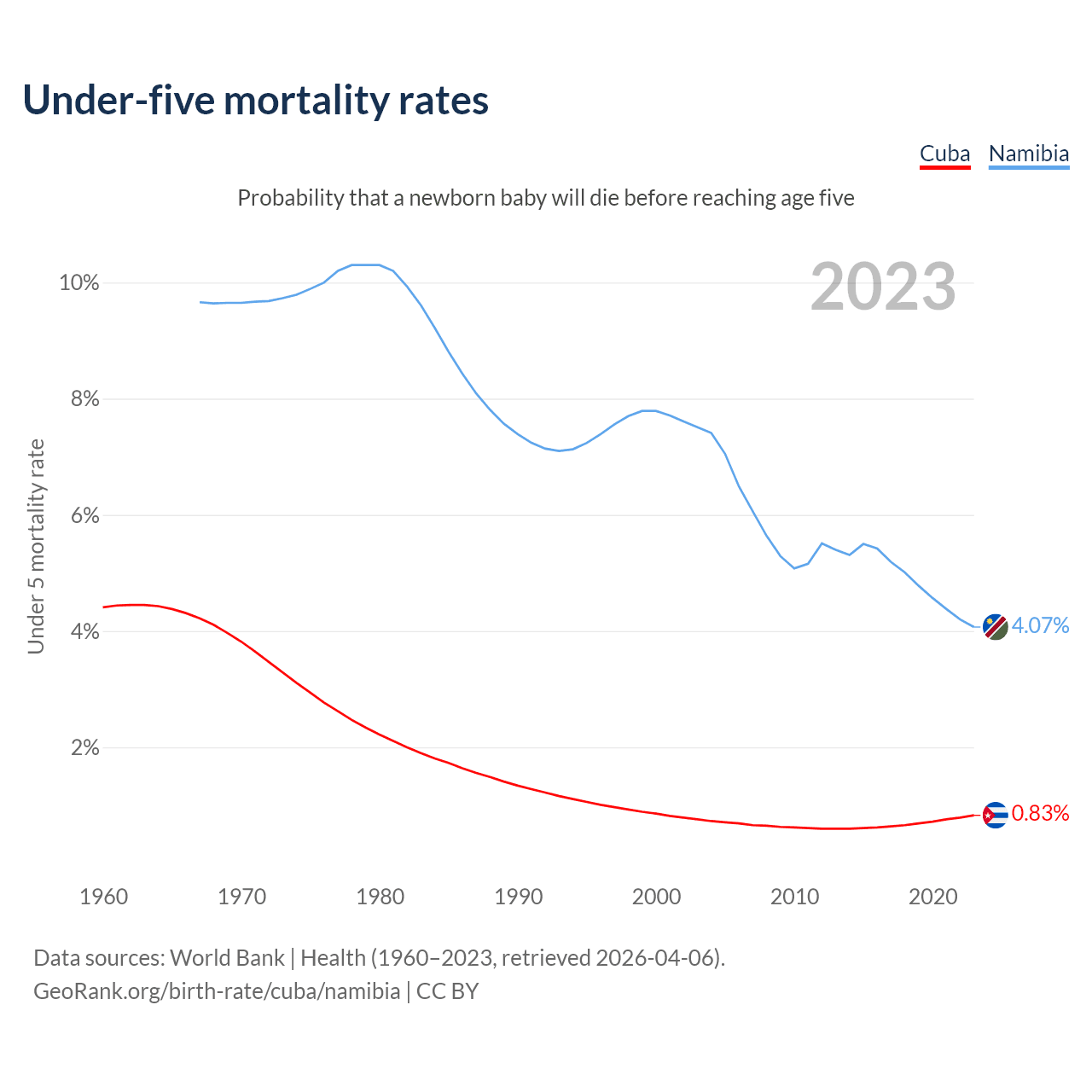 The chance that a newborn baby will die before reaching age five is 0.83% in Cuba and 4.07% in Namibia. Above is a chart with historical data on under-five mortality rates.