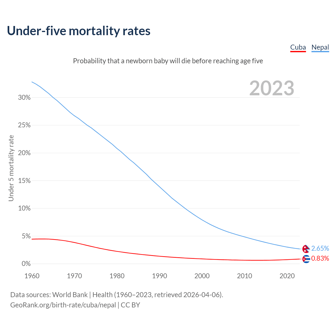 The chance that a newborn baby will die before reaching age five is 0.83% in Cuba and 2.65% in Nepal. Above is a chart with historical data on under-five mortality rates.