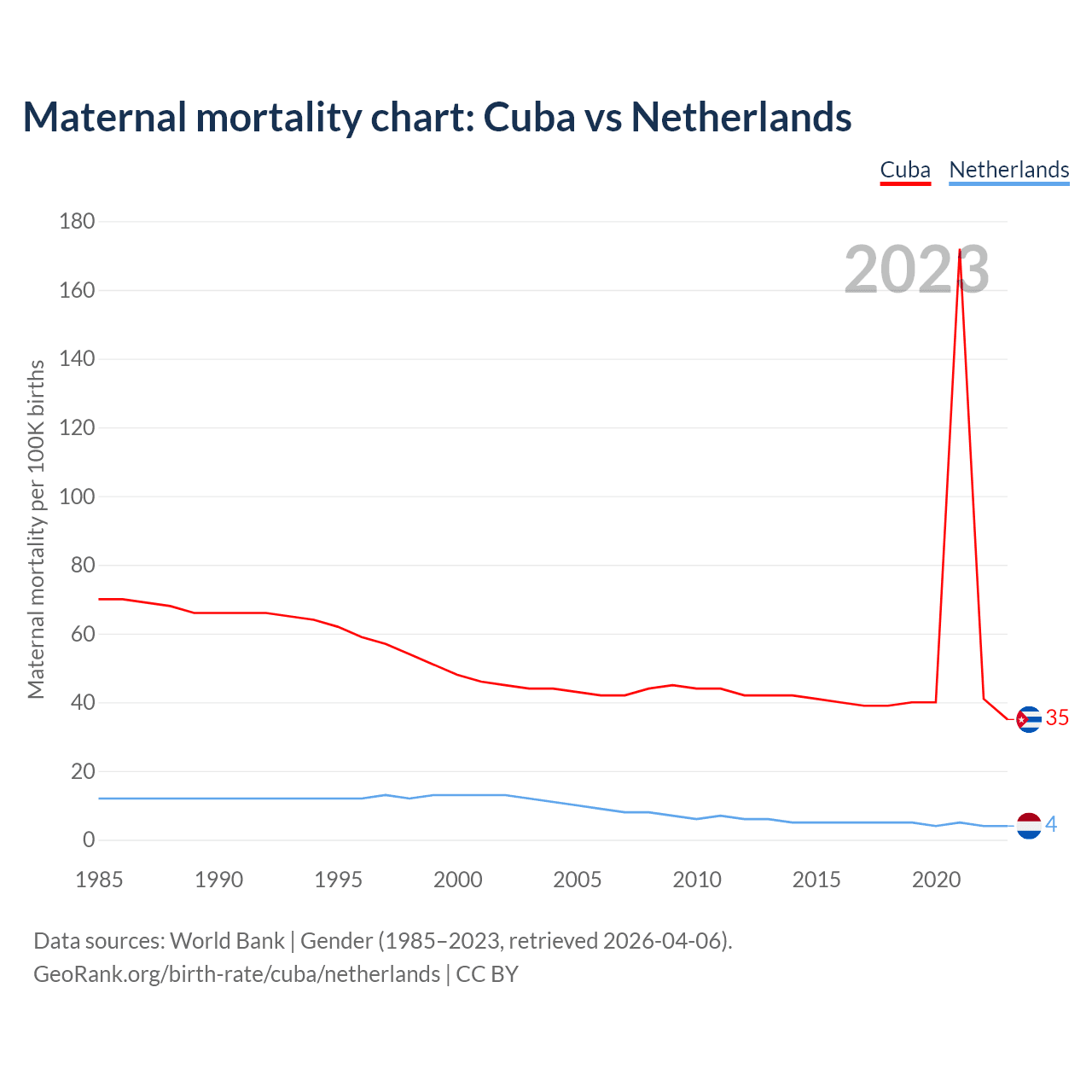 The maternal mortality rate, which is the probability of dying during childbirth or within 42 days of pregnancy termination, is 35 deaths per 100,000 live births in Cuba, compared to 4 deaths in the Netherlands.