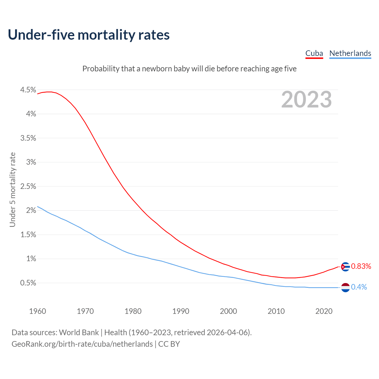 The chance that a newborn baby will die before reaching age five is 0.83% in Cuba and 0.4% in the Netherlands. Above is a chart with historical data on under-five mortality rates.