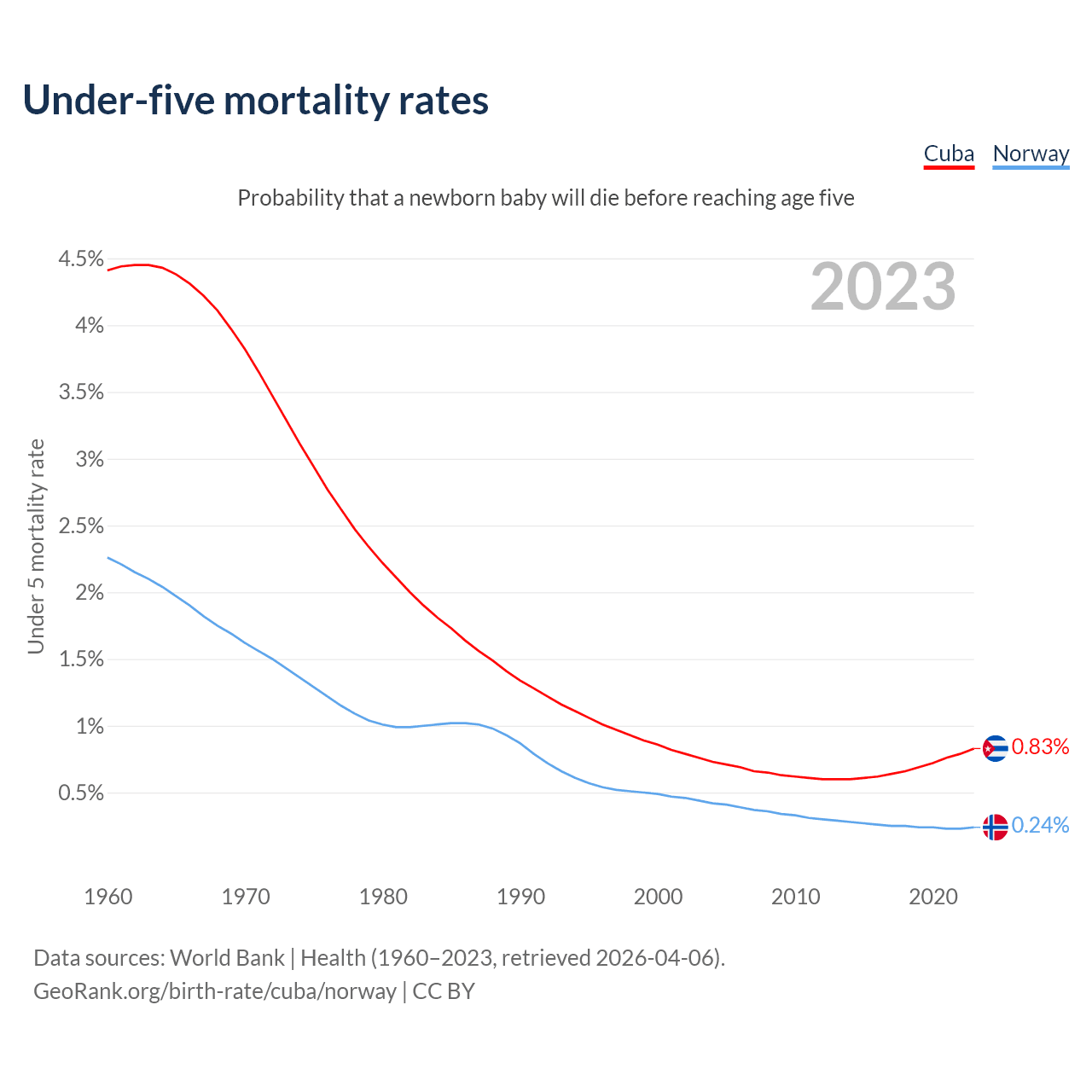 The chance that a newborn baby will die before reaching age five is 0.83% in Cuba and 0.24% in Norway. Above is a chart with historical data on under-five mortality rates.